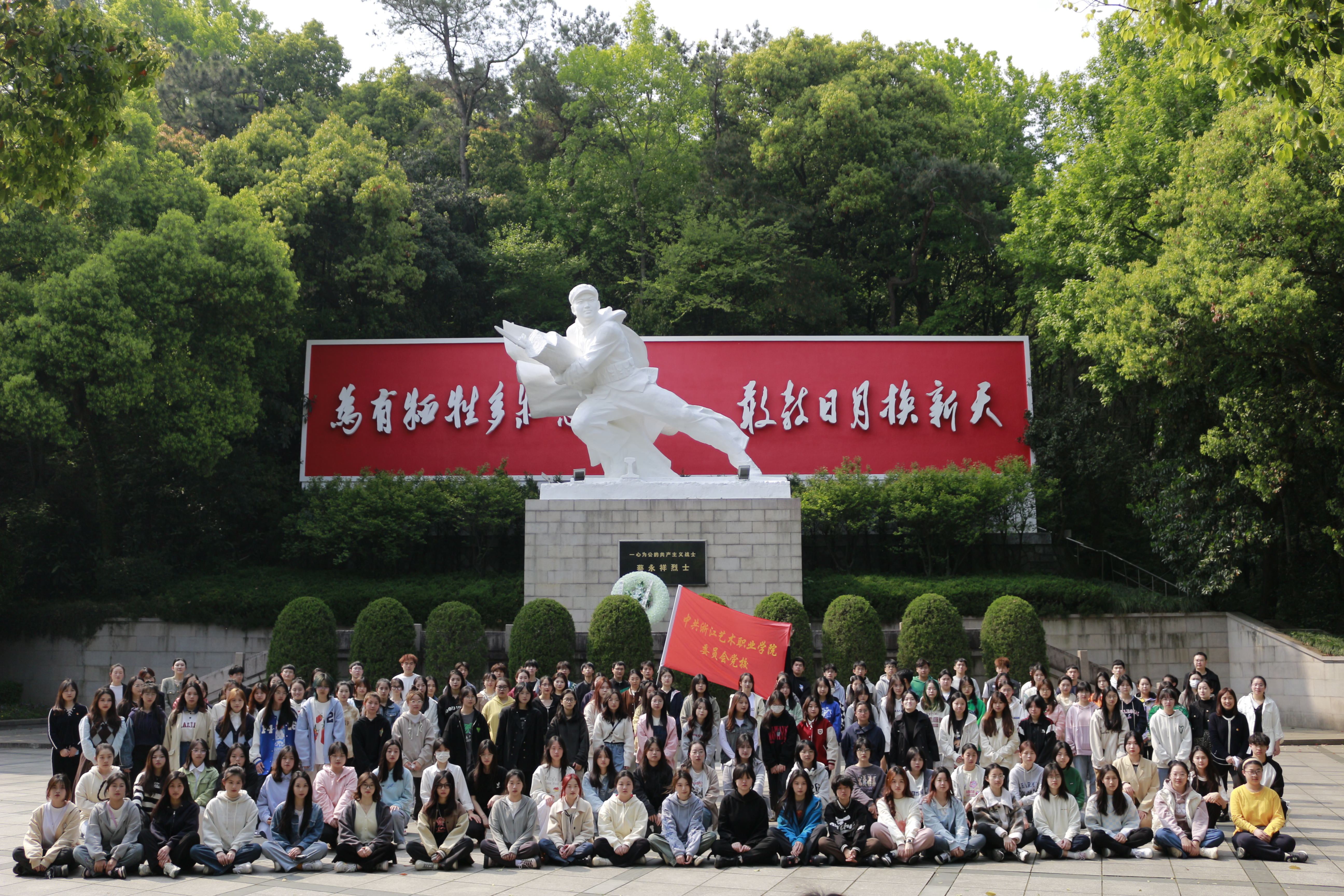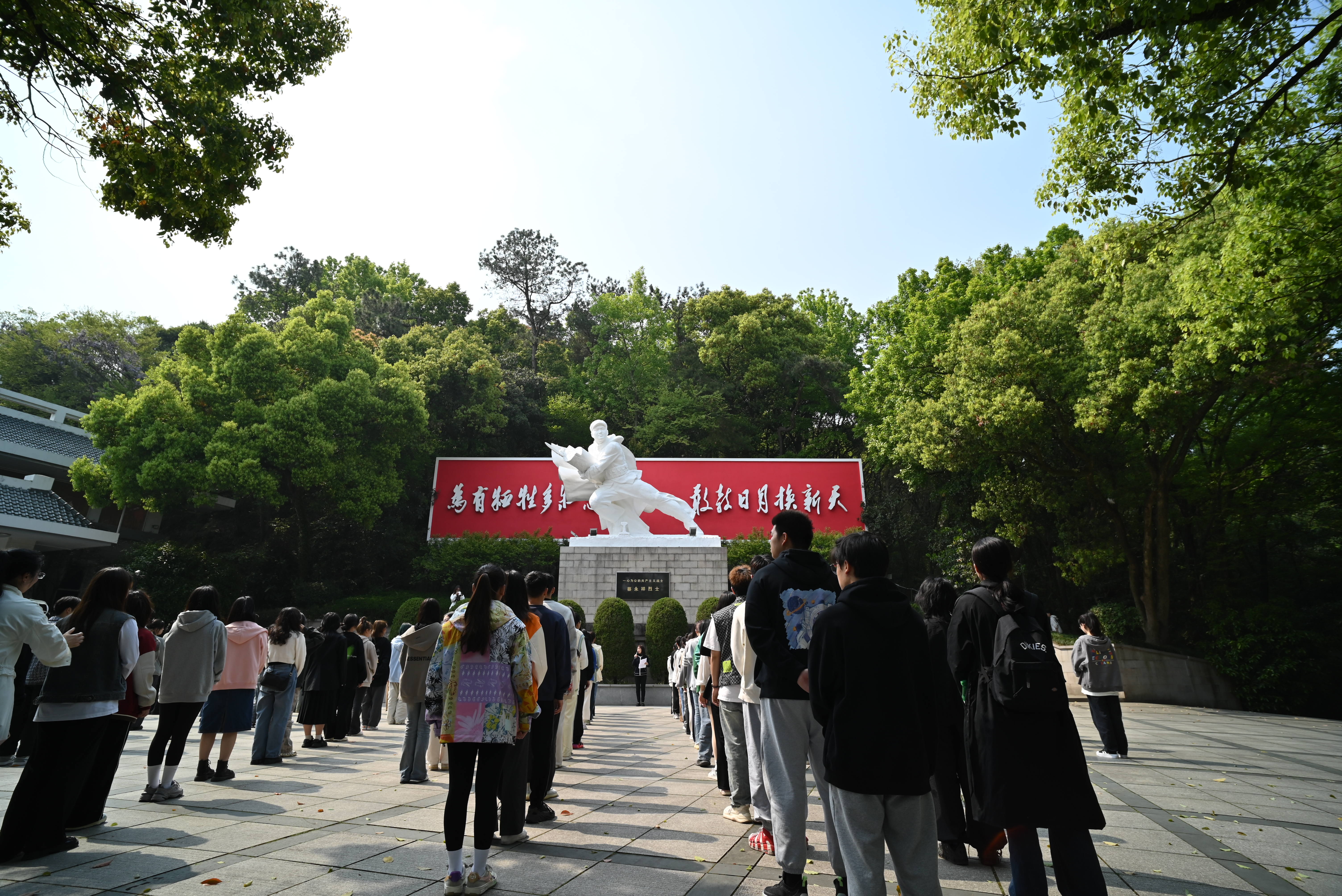 沿着青石板路上行,穿过青松翠竹,同学们情不自禁地追思起那些见义勇为、不畏牺牲的烈士们。往上攀爬,映入眼帘的是一座伟岸的雕像,记录了烈士蔡永祥同志牺牲时的英勇身姿,其身后红墙上“为有牺牲多壮志,敢叫日月换新天”赫然醒目。