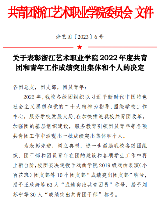 近日,共青团浙江艺术职业学院委员会发文表彰了2022年度浙江艺术职业学院共青团和青年工作成绩突出集体和个人,戏剧影视学院2021级影视制片与管理班团支部、2021级音像技术班团支部获评“成绩突出团支部”。
