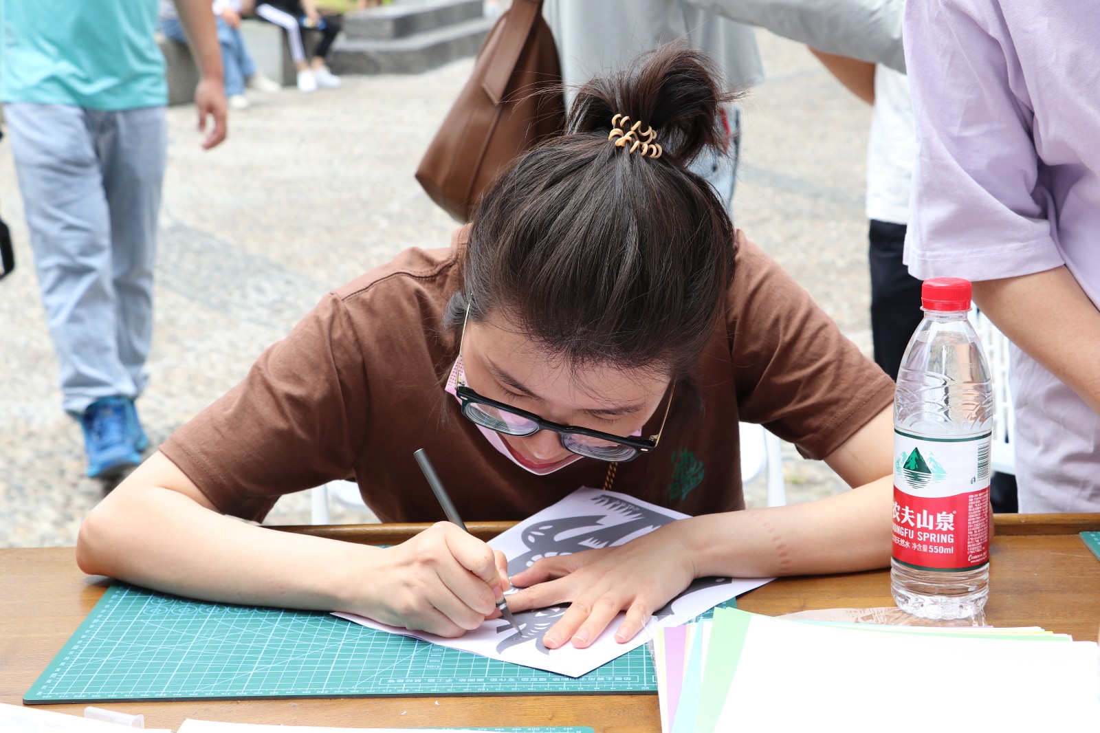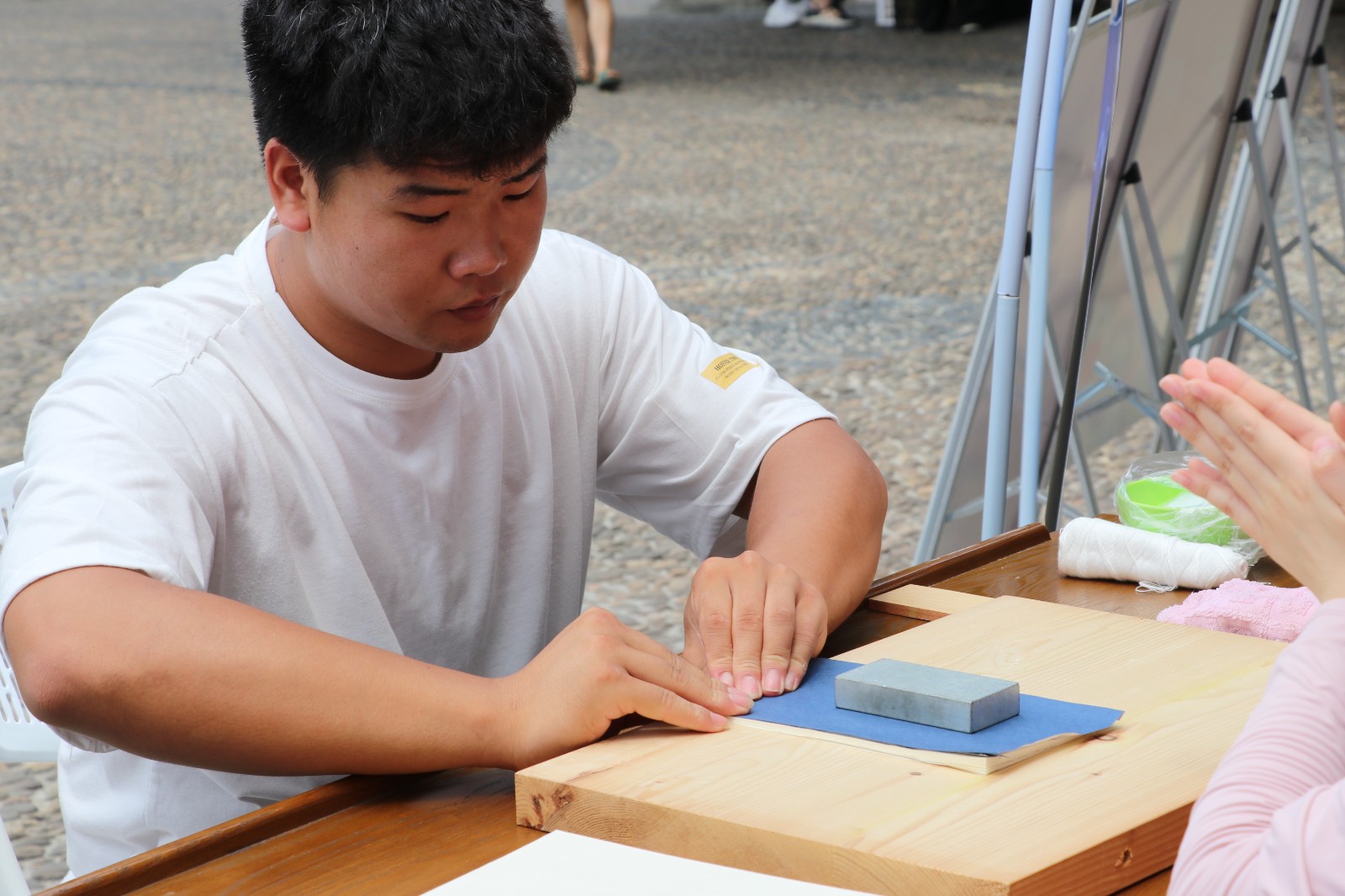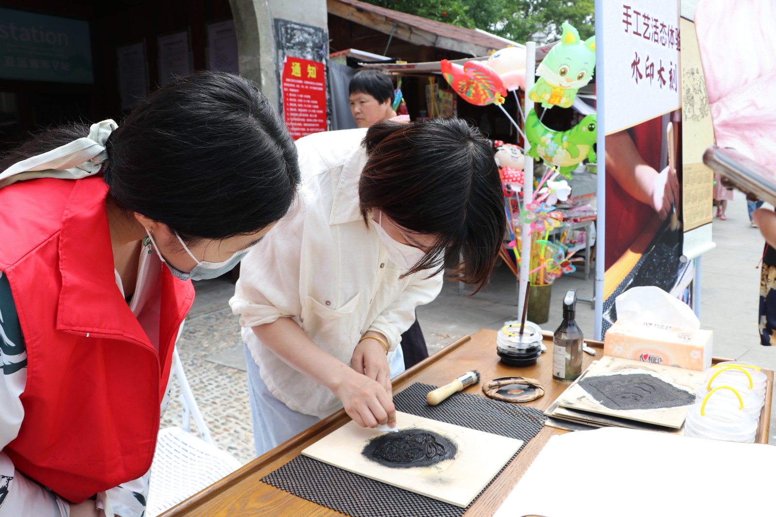 在水印木刻的摊位上,艺小匠同学详细示范了木版水印画的印制步骤。在艺小匠的指导下,体验者们有模有样地将蘸取墨水的刷子在木版上刷色,仔细地均匀涂抹版面,观察好版面的位置后,把宣纸对准印版平铺,借助马莲在平铺的纸上来回旋转摩擦,使纸面和版面上的墨充分接触。