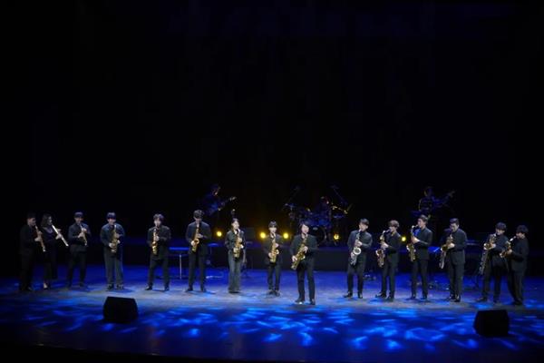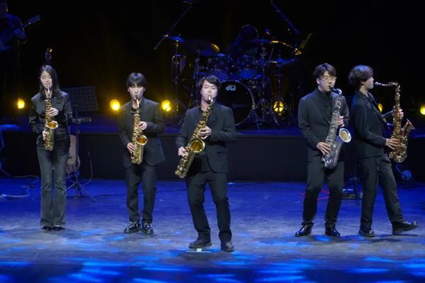 Z萨克斯管乐团再度登场,掀开了晚会的第三板块。乐团首次与流行乐队同台合作演绎《Sax and Co Song》,精心设计编排的声部织体为音乐注入了许多新元素,精彩异常、热闹非凡,现场掌声不断。《Omens of loves》为日本知名融合爵士乐团T-SQUARE的代表作之一,干净利落的强劲节拍,电吹管的加入让作品更为高亢明亮。