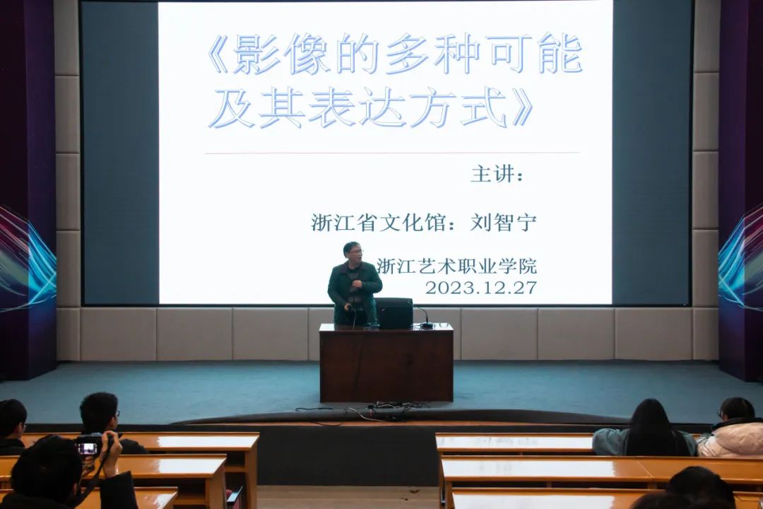 12月27日下午,“双建争先·提效创优”——浙江省文化馆党员艺术宣讲进高校·浙江艺术职业学院系列专场在图信中心报告厅举行。浙江省文化馆党员艺术宣讲团成员刘智宁带来以“影像的多种可能及其表达方式”为主题的讲座。戏剧影视学院党总支书记许瑛,2022、2023级摄影摄像专业学生参加讲座。讲座由戏剧影视学院学工主管颉顺虎主持。