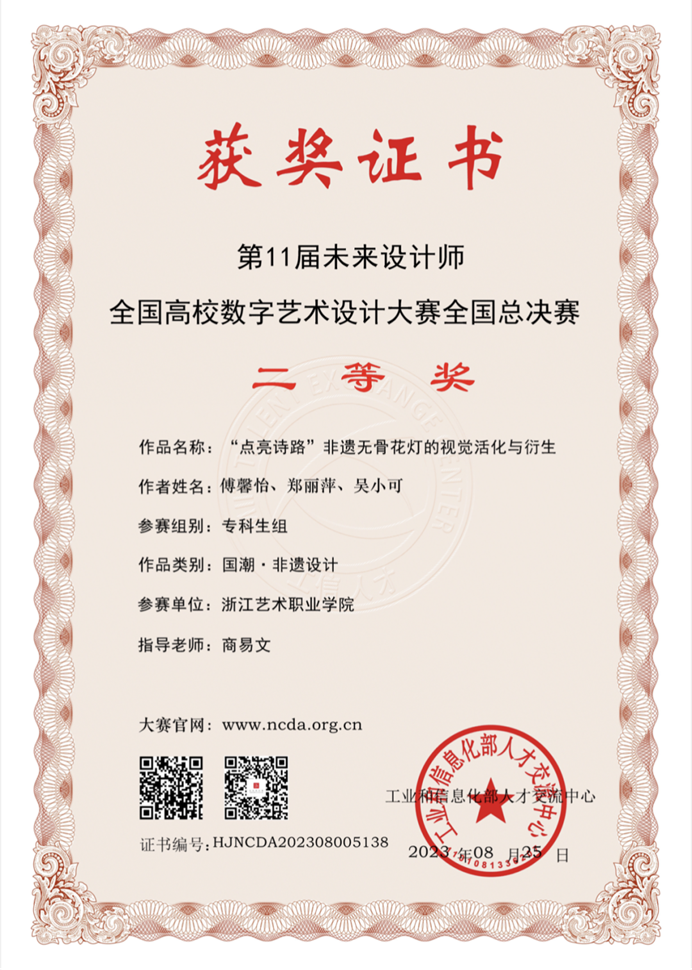 经过激烈的角逐和层层选拔,设计学院广告艺术设计专业师生在此次大赛中获得优异成绩,专业教师刘俊指导学生汪靖雯、侯恋慈、邹岚的作品《“畲遗物语”浙江畲族村文化品牌设计》获全国总决赛一等奖,刘俊获优秀指导教师。专业教师商易文指导学生傅馨怡、吴小可的作品《“点亮诗路”非遗无骨花灯的视觉活化与衍生》获全国总决赛二等奖,商易文获优秀指导教师。