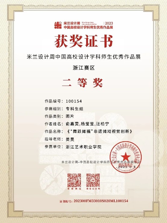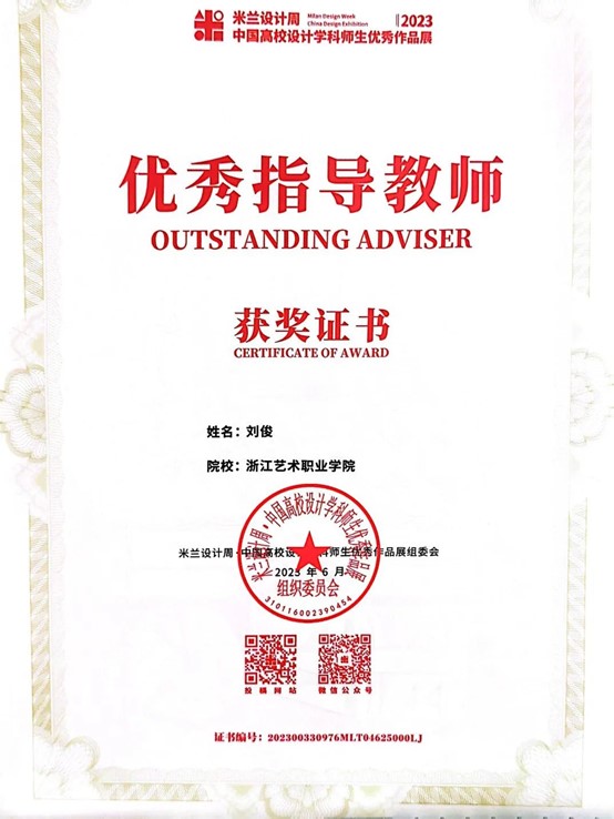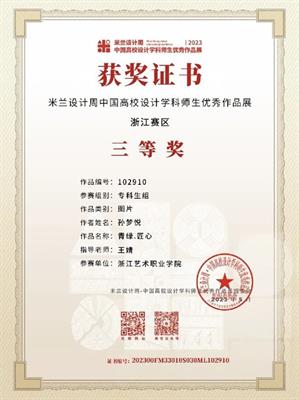 为提高学生运用知识解决实际问题的能力,积极鼓励学生参加各类专业竞赛,培养具有创新精神和实践能力的高素质技术技能人才。近日,由设计学院各专业教师指导的学生作品在2023“米兰设计周——中国高校设计学科师生优秀作品展”中喜获佳绩。经过校内选拔、浙江赛区选拔,作品获得国赛一等奖1项,三等奖1项;浙江赛区获省一等奖1项、二等奖4项、三等奖5项的好成绩。