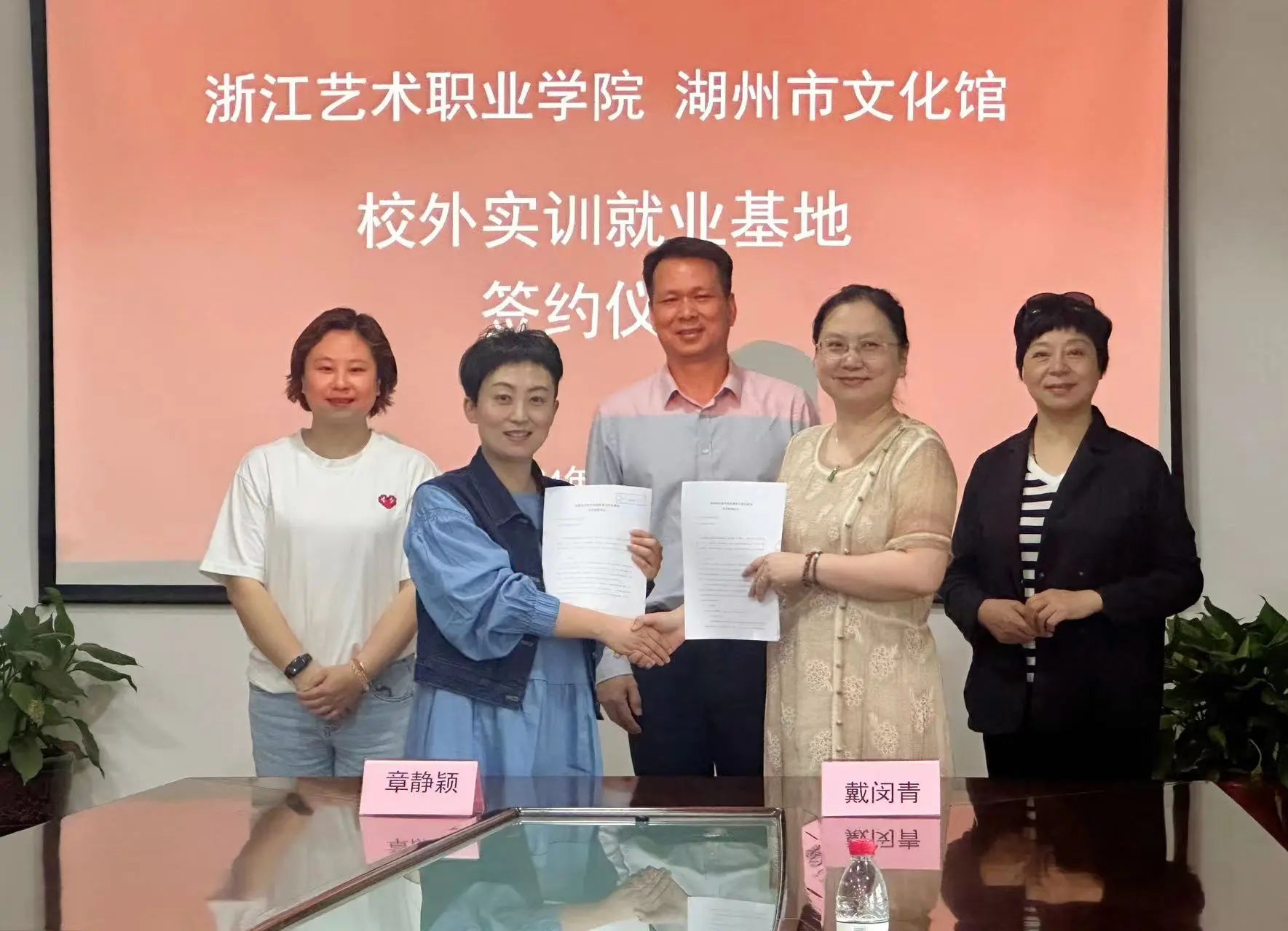 5月20日,浙江艺术职业学院产学合作处处长屠灵华、演艺与教育学院党总支书记戴闵青、副院长荆芳以及表演艺术专业教研室主任牛硕等一行赴湖州市文化馆,开展校地合作校外实践教学与就业基地合作框架协议签约,并举行校外实训就业基地授牌仪式。