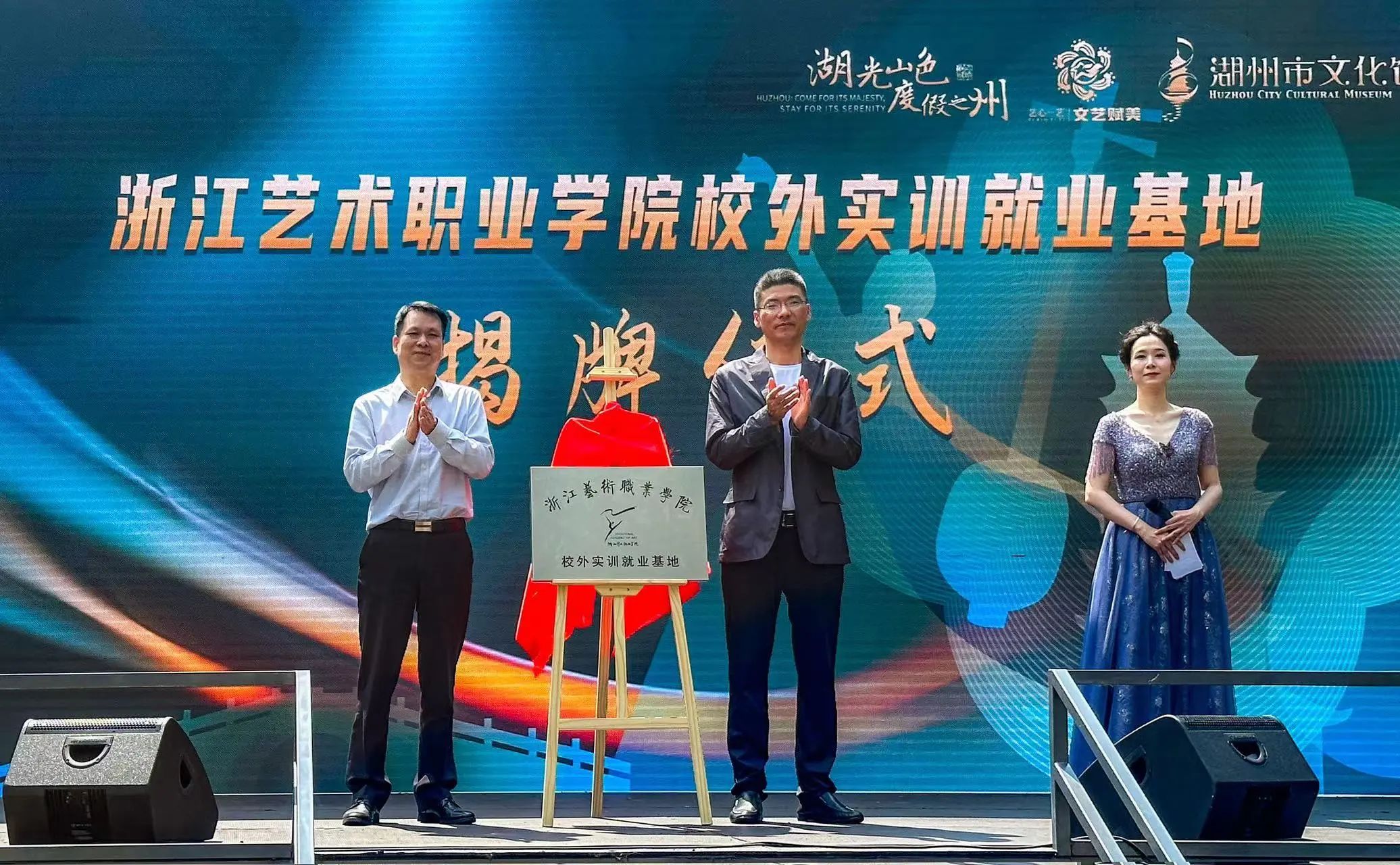 此外,还举行了浙江艺术职业学院与湖州市文化馆校外实训就业基地的揭牌仪式,浙江艺术职业学院产学合作处屠灵华处长代表学校与湖州市文化广电旅游局副局副局长金加宝共同揭牌。
