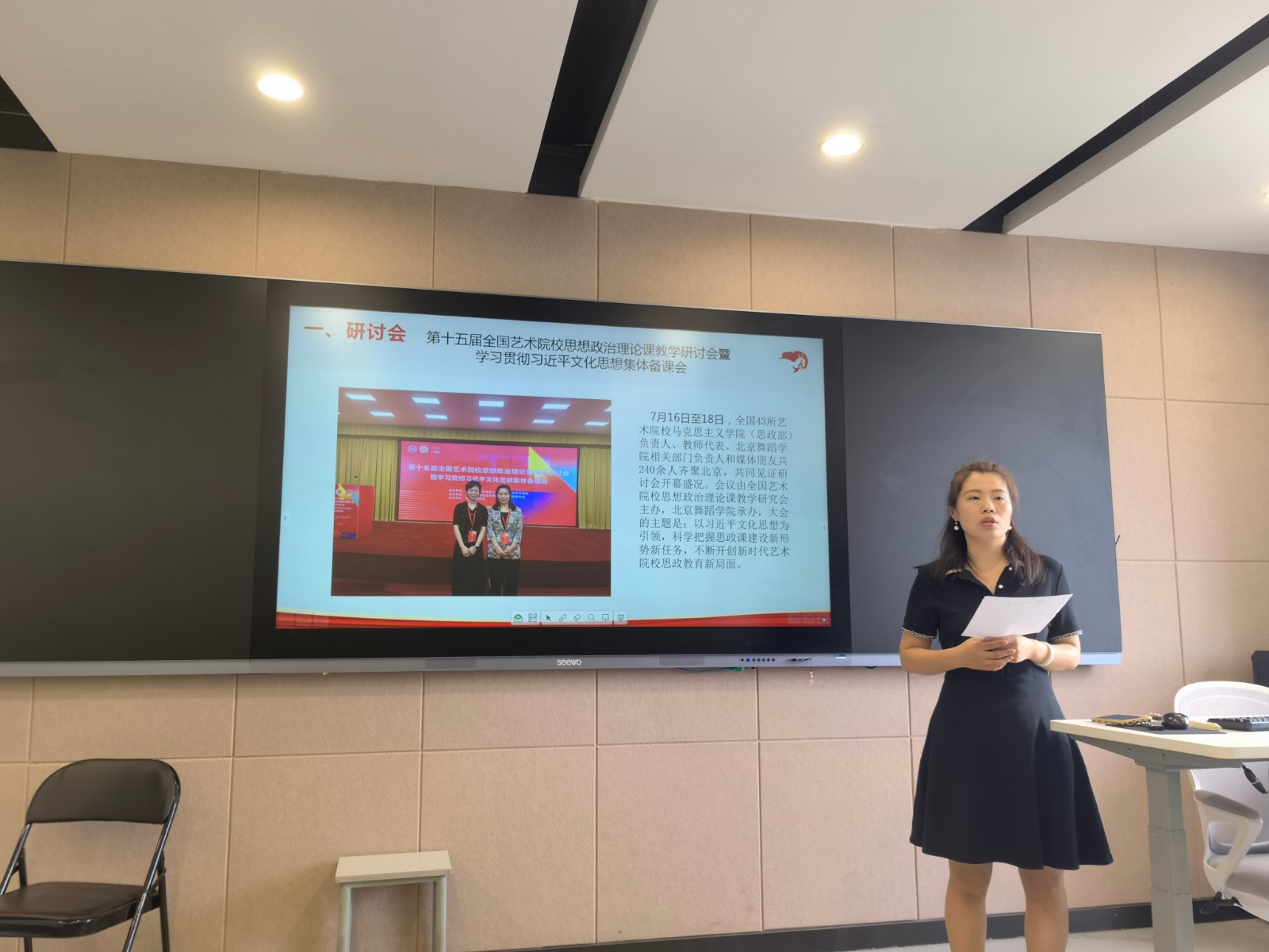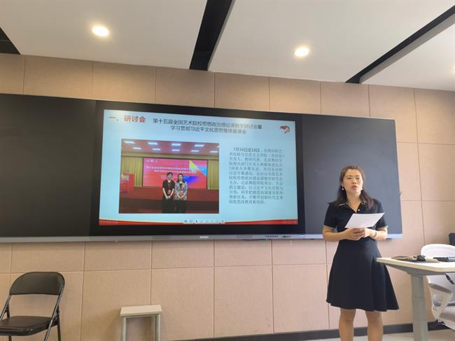王筱芽、高小伶、王儿等三位教师先后分享了参加全国艺术院校思想政治理论课教学研讨会以及教育部研修的学习内容和心得,畅谈感悟收获;胡卓群、曾近、蔡秀、陈丽丽等四位教师也分别汇报了参加集体备课会的所学所感,在交流分享中进一步消化、转化、深化、拓展学习培训效果。