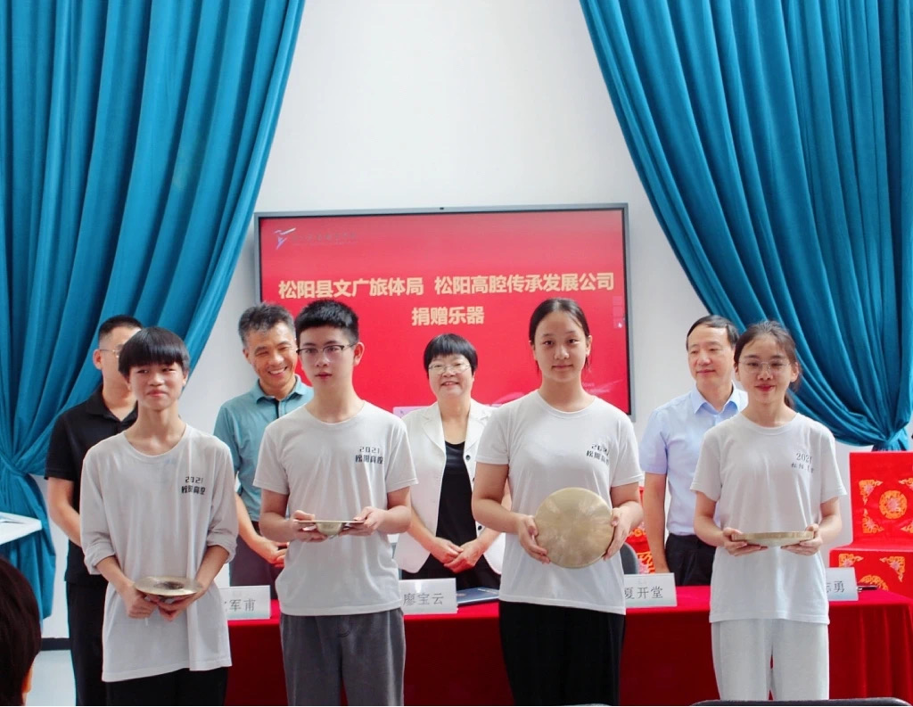 松阳县文广旅体局副局长徐伟锋代表松阳县文广旅体局以及下辖松阳高腔传承发展公司为学生代表赠送了教学乐器。