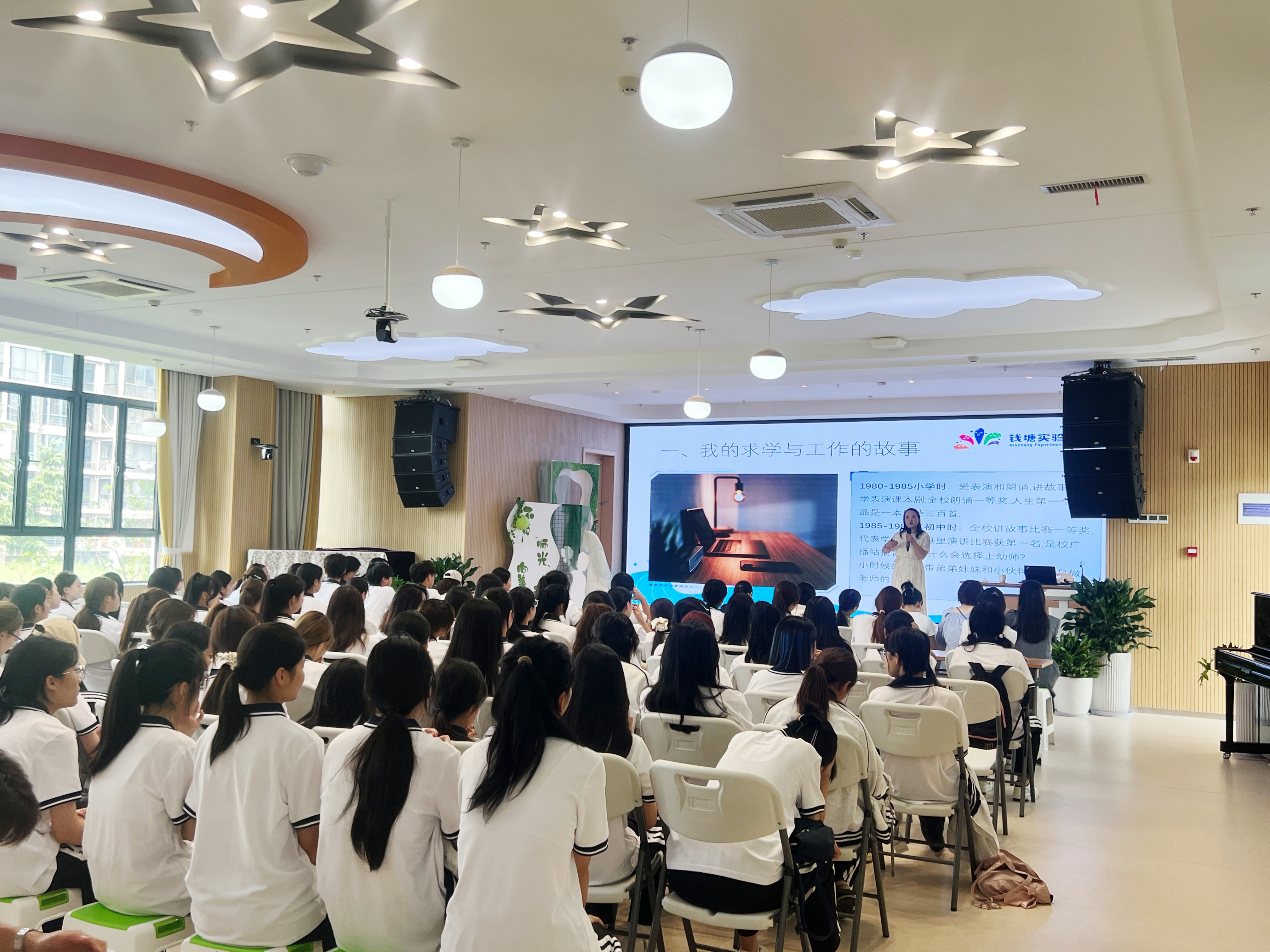钱塘实验幼儿园园长陈英及3位教师代表与新生们进行了亲切交流。她们结合自身在专业选择、大学学习阶段的亲身经历,娓娓道来,拉近了与同学们的距离。3位老师轮流分享了入职后与孩子们相处的温暖教育故事,生动展现了幼儿教师工作的专业性与幸福感,让新生们对未来的职业角色有了更具体、更感性的认知。