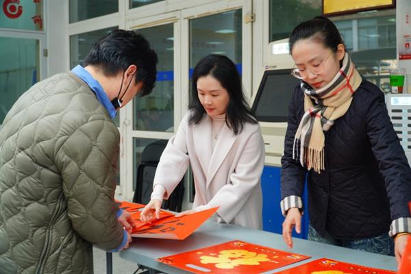 活动热度还延伸至校园各处,食堂门前特设的“送福处”格外热闹。红纸铺展,翰墨飘香,老师们将提前书写好的“福”字与春联赠予来往师生。大家欣然接过这份特殊的节日礼物,笑语与祝福声交织,为冬日校园平添了一抹温暖的年味。不少师生举起“福”字与春联合影留念,镜头记录下这份亲手传递的温暖,更凝聚起全校师生对新年的共同向往。