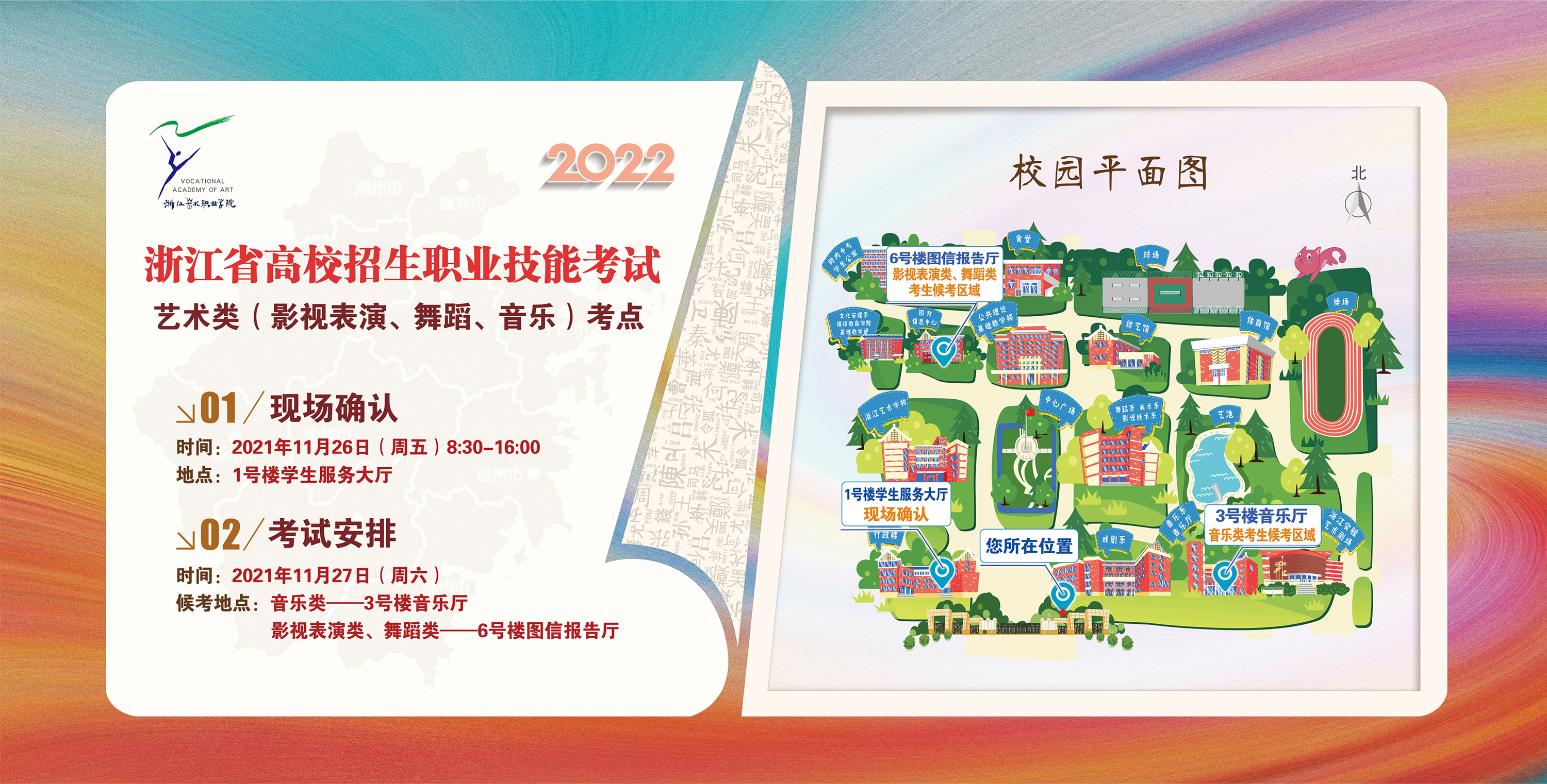请考生持本人身份证于2021年11月26日(周五)8:30-16:00到浙江艺术职业学院1号楼学生服务大厅办理报到手续和现场确认,领取准考证,并了解考试编组情况。现场确认时须上交《健康状况报告表》。