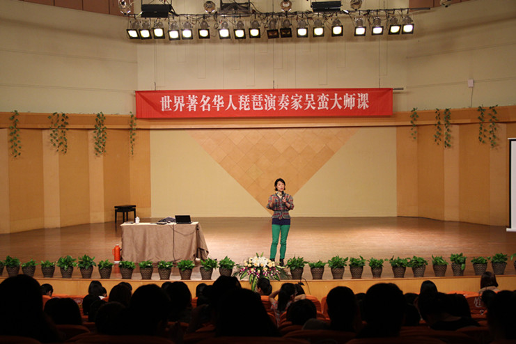 《春江花月夜》、《十面埋伏》、《静夜思》、《九月扬花飞》、《跳吧!》,从传统琵琶古曲到新派琵琶音乐,吴蛮用独特的革新与创举将琵琶介绍到西方,开拓一条“中西合璧,纳古于今”的琵琶之路。课上,她从传统音乐的自信心、合作演奏的新作品和音乐跨界问题这三方面来阐述民乐人如何以独特视角看中国传统音乐在国际中的发展。带着琵琶闯荡天下,没有信心真得难成大家。90年初,美国没有人知道中国传统乐器,也没有人了解中国传统音乐,作为单身一人独闯美国的琵琶演奏家,吴蛮用强大的自信心和扎实的功底,向世界介绍中国的民乐,介绍中国的传统文化。她认为音乐无国界,传统音乐比西洋乐更有发展空间,学生应做好扎实的基本功训练,认真学习,持之以恒,静心感悟,这样定能在音乐道路上有美好的发展前景。在演奏新作品时,她提醒学生不能遗忘传统根基,只炫技巧,要了解整部作品的结构、内容,把握每一次独奏、合奏的机会,多与作曲者交流,让作曲者了解乐器特点,在交流探讨中创造出优秀的作品。如何将琵琶与世界各类音乐跨界合作,创作出既具中国民族特色,又有时尚气息的世界音乐,这需要每位演奏家相互配合,取其精华,这样才能创作出浑然一体、旋律动人、广为流传的世界音乐。现场,为配合演讲内容,吴蛮还播放几段个人跨界合作的音乐作品。当代音乐不仅仅属于西方,它属于全世界,属于全人类。在演讲中,她无时无刻都传递着这样一个信息:传统即是国际。