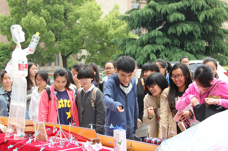 参赛作品风格迥异,有用废旧矿泉水瓶制作的“水瓶超人”,有用闲置T恤制作的围裙,有用一次性筷子制作的相框……作品名称也别出心裁,如“石生花”,“少女时代”,“”Spring”,“兔子不吃窝边草”等,各种新颖的创意吸引师生驻足观看。投票环境,创意无限,用废旧展板的反面画上不同形状的树木,选用废旧的纽扣作为选票,让大众在自己喜欢的作品对应的大树上黏贴纽扣(选票),最后汇聚成一幅幅美丽的图画。这种形式体现绿色环保的主题,也得到师生的一致赞许,六百个纽扣在半个多小时内全部用完,姗姗来迟的师生对未能投上宝贵一票而深感遗憾。根据评委评分和现场的投票结果,最终评选出最佳人气奖、最佳创意奖、最佳设计奖、最具特色奖、最具实用奖、最具环保奖获奖和优秀奖等奖项。