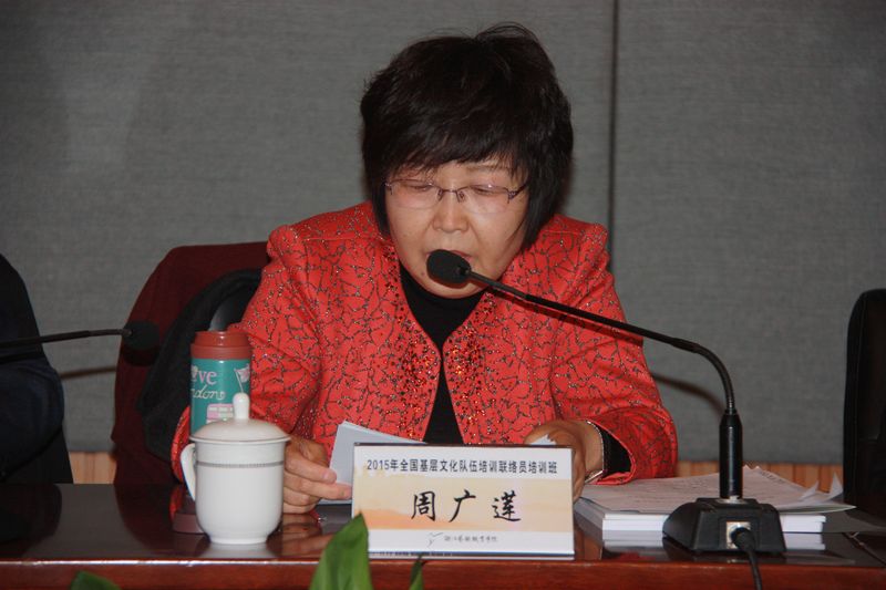 周广莲在讲话中对2014年全国基层文化培训工作进行总结。她认为培训工作稳固推进,亮点突出,在前几年工作的基础上迈上了新的台阶:一、分级负责、分类实施,全国基层文化队伍培训工作成果显著。二、开拓创新、整合资源,全国基层文化队伍培训工作全面提升:一是完善工作机制,提高培训工作的规范化和科学化水平;二是以需求为导向,提升培训工作的针对性和有效性;三是创新培训方式,整合培训资源,扩大培训工作的覆盖面和影响力;四是坚持重心下移,面向基层,向西部地区倾斜。她对2015年全国基层文化队伍培训工作提出要求:一是增强责任感和使命感,努力完成“十二五”期间基层文化队伍培训工作的目标任务;二是围绕构建现代公共文化服务体系各项重点工作,及时开展基层文化队伍培训;三是进一步整合地方培训资源,加强师资库和教材建设;四是进一步完善培训工作长效机制;五是适时组织开展基层文化队伍培训督查工作;六是统筹规划“十三五”全国基层文化培训工作。