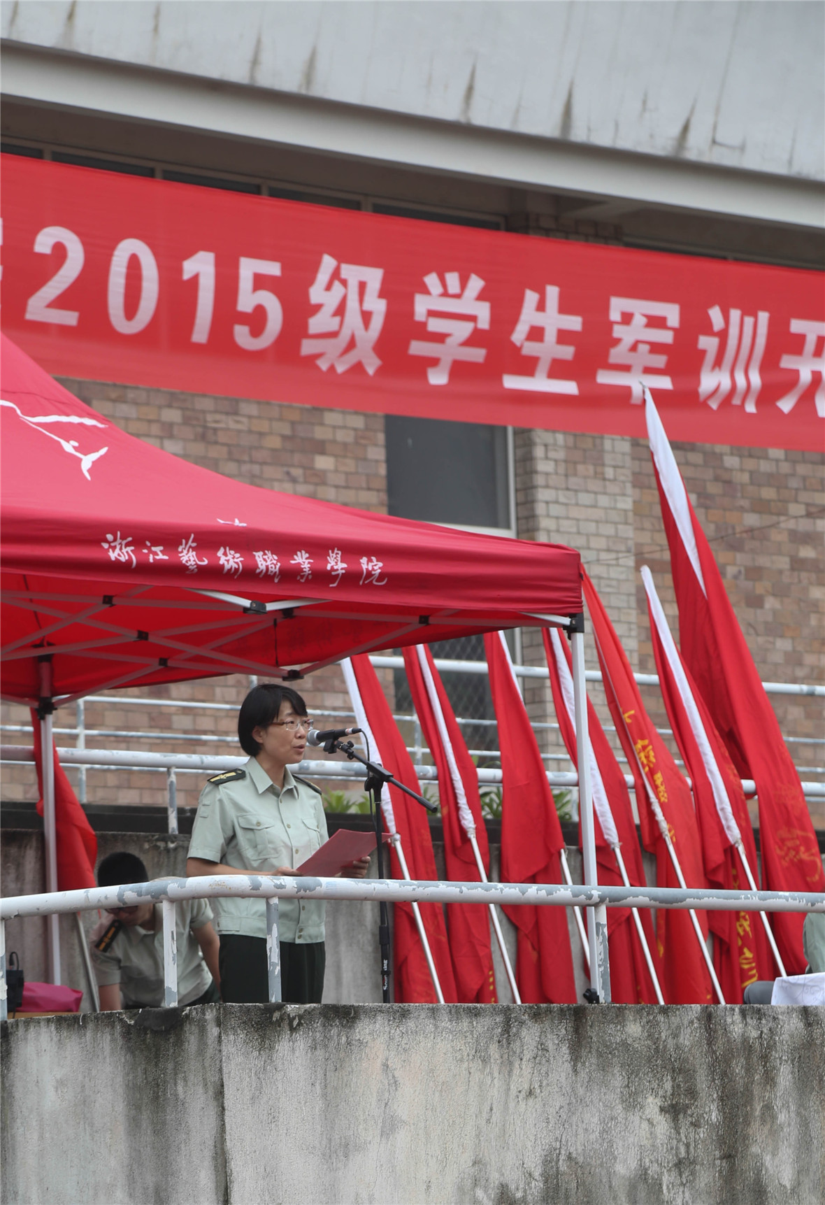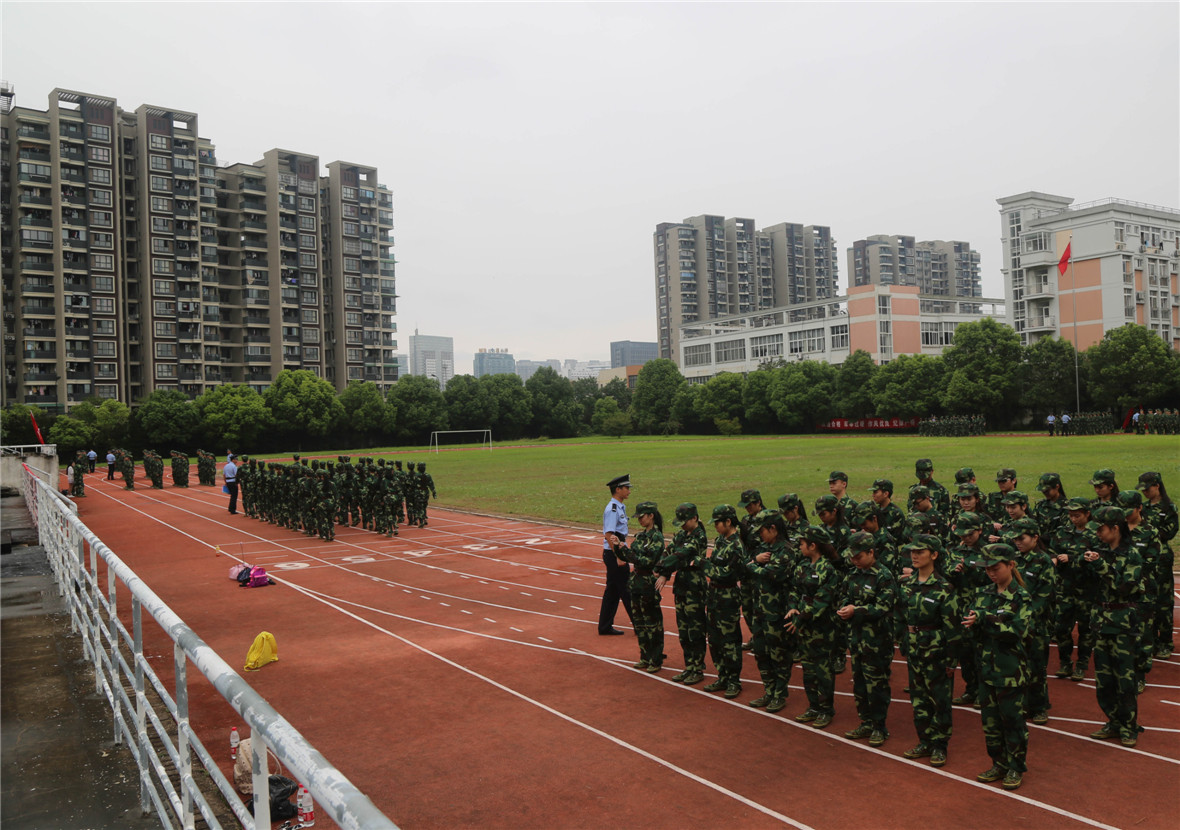 9月15日下午,我院2015级高职学生军训开营仪式在操场举行。浙江警察学院学生工作处副处长曹东明、教官代表方杭富,院党委书记、副院长朱海闵,及学院相关系部负责人出席,顾斌主持仪式。