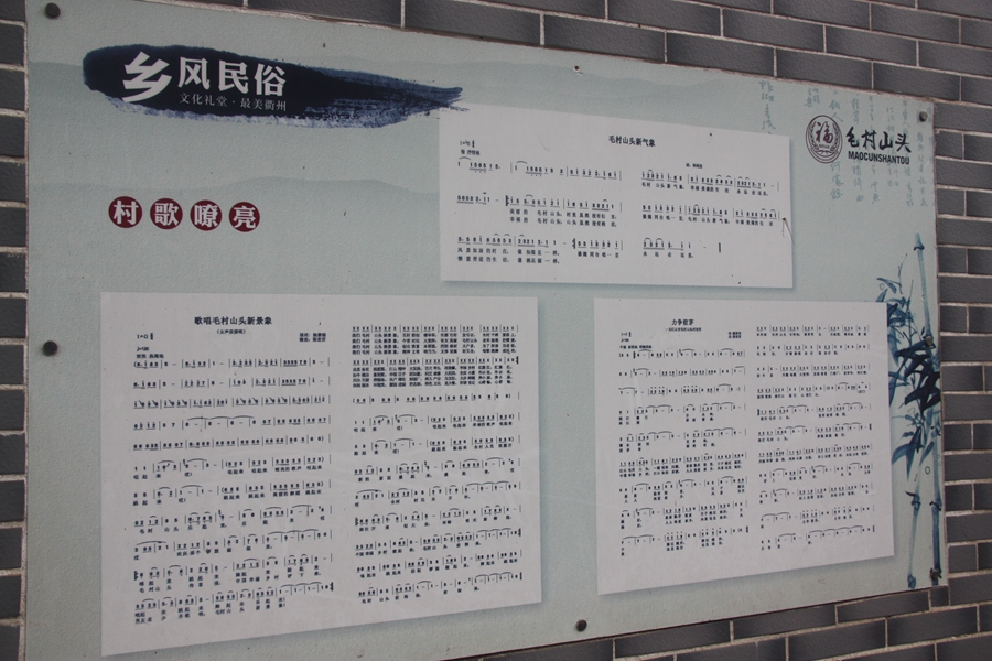 毛村山头村前任周书记向大家介绍道:村歌代表的是我们村的精神风貌,我们都很喜欢,我们歌唱天蓝、地绿、水清、人和。但每次参加村歌比赛时都拿不到很好的奖项,主要原因是我们还不够专业,希望在水平上有更大的提高。