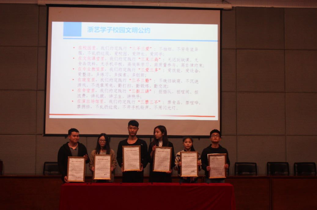 动员大会上,院学生会杨赠琳同学宣读了全省大学生文明修身行动倡议书,各系学生会主席代表各系学生签订《浙艺学子校园文明公约》。