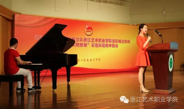 5月4日9:30,浙江文化志愿者总队浙江艺术职业学院支队成立仪式暨学校“文明修身”示范实验班申报会在学校音乐厅举行。院长张建国、党委副书记黄杭娟,学校相关职能处室、各系部党总支负责人出席,院系两级团学组织负责人,各班班长团支书等400余人参加活动。活动由音乐系党总支副书记、副主任,院团委书记章蔓丽主持。