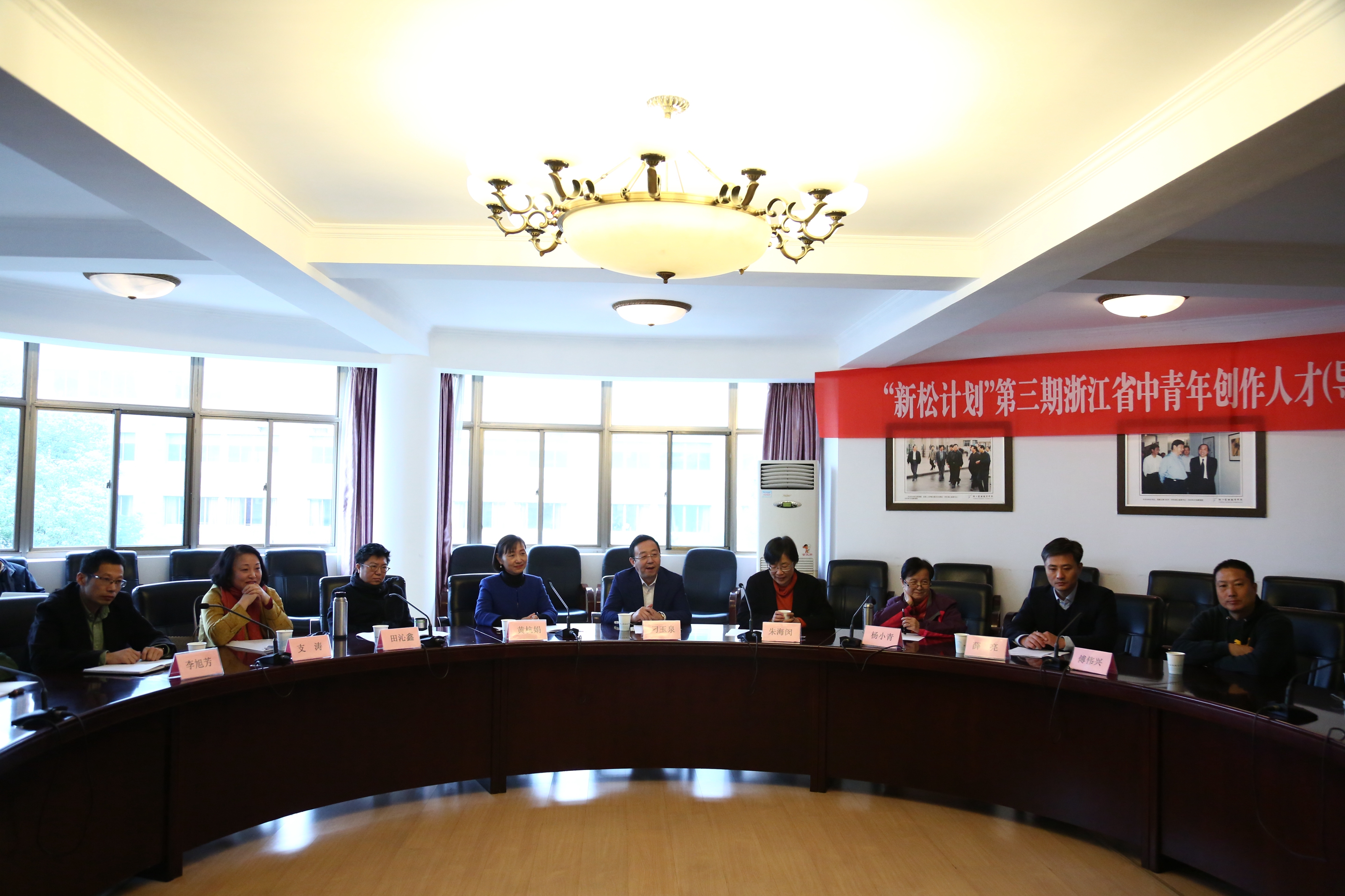 11月9日,“新松计划”第三期全省中青年创作人才(导演)高级研修班在浙江艺术职业学院开班。本期培训班师资团队名家荟萃,主教是浙江艺术职业学院特聘教授、一级导演杨小青,授课老师特邀中国国家话剧院一级导演、北京大学影视戏剧研究中心副主任、上海戏剧学院教授田沁鑫,上海戏曲艺术中心艺委会主任、一级编剧李莉,中央戏剧学院原副院长、博导罗锦鳞与戏文系主任、教授彭涛,上海戏剧学院教授、导演田蔓莎,著名舞美专家刘科栋、周正平、蓝玲,以及著名编剧、策划人史航、著名舞蹈编导李世博等。省文化厅副厅长刁玉泉、浙江艺术职业学院党委书记朱海闵,教师代表杨小青、田沁鑫,省文化厅艺术处处长薛亮,以及负责此次高研班的浙艺戏剧系主任支涛等教师、高研班全体学员参加开班仪式。院长黄杭娟主持。