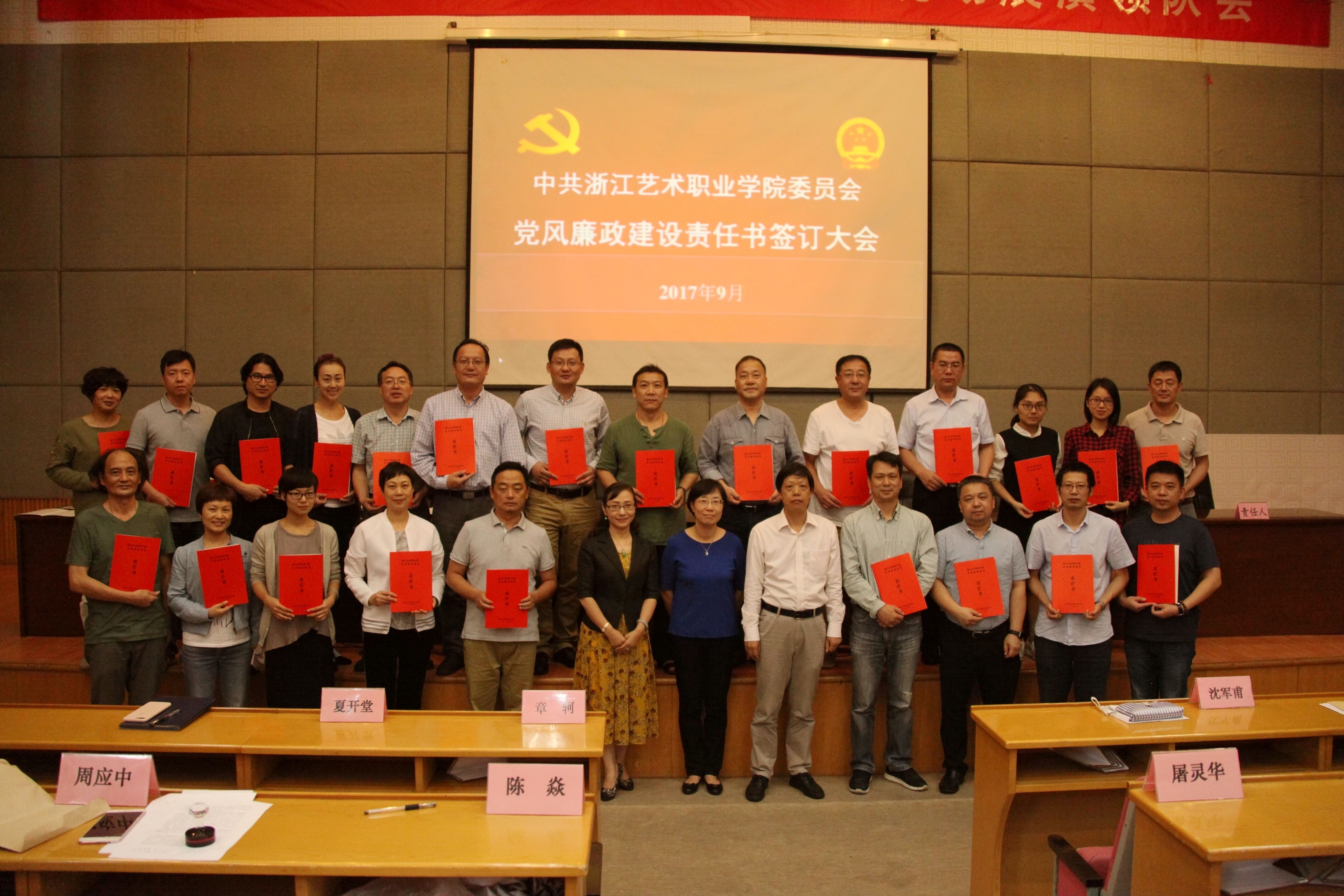 9月28日中午,浙江艺术职业学院党风廉政建设责任书签订大会在图信报告厅举行。党委书记朱海闵,院长、党委副书记黄杭娟与各教学单位、行政部门党政负责人签订了党风廉政建设责任书。党委委员、纪委书记徐芳主持签订仪式。