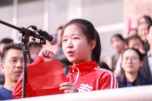 17级音乐系李响同学作为学生代表发言:“严格遵守比赛规则,严格保证赛场纪律,服从裁判,尊重对手,发扬拼搏精神,胜不娇,败不馁,发挥出最好成绩,祝本届运动会圆满成功!”