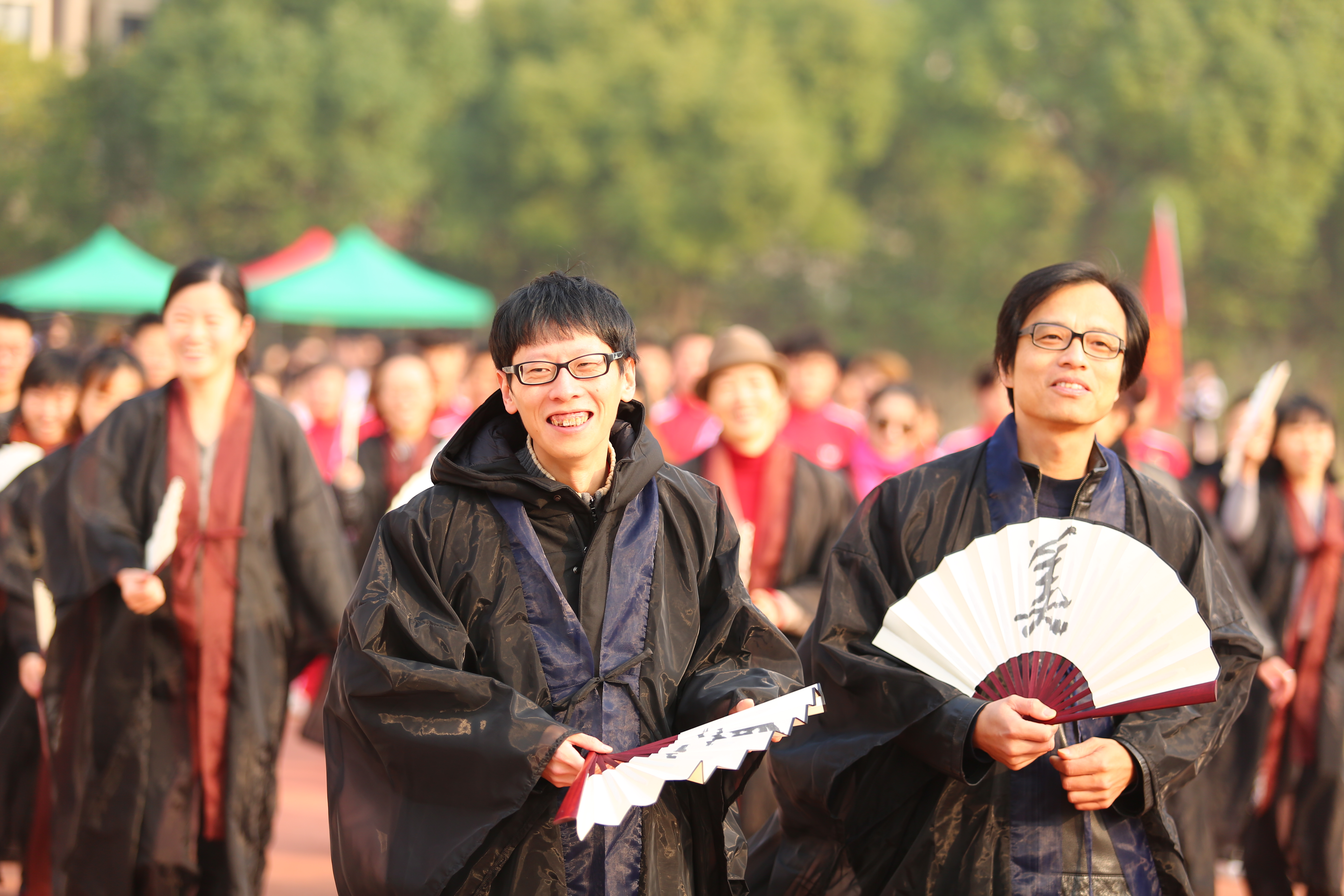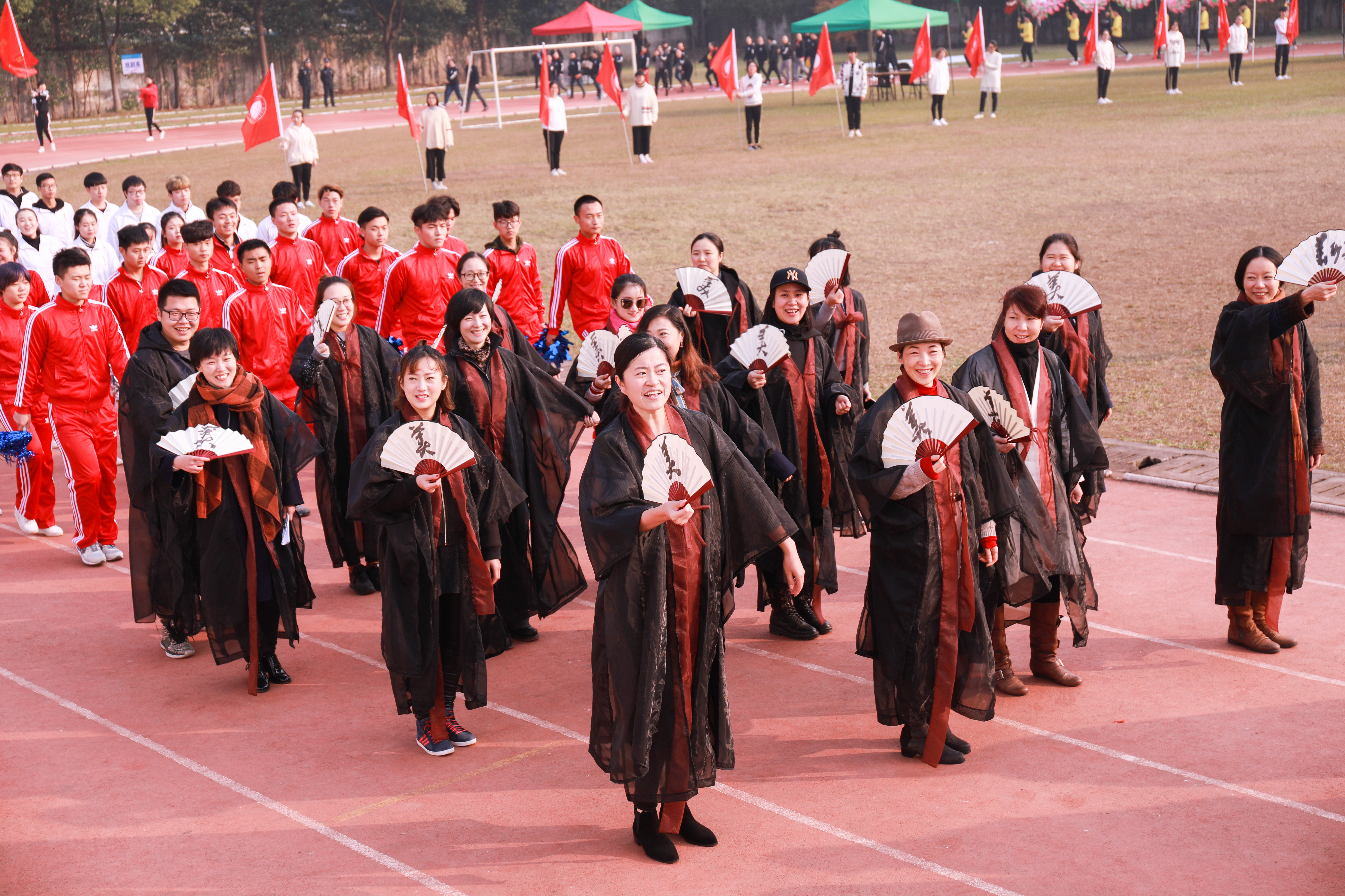 难得的艳阳天仿佛是为了迎接这场运动会。绿荫操场上,每一位师生都精神饱满,脸上洋溢着灿烂的笑容。经过充分的准备,各代表团运动员们在本系老师们的带领下以昂扬的姿态迈着整齐有力的步伐走入田径场。这群如阳光般炽热的青年,焕发着青春的光彩和力量。六个系的入场式可谓“六仙过海”各显“神通”。比如美术系的老师们身披对披,羽化飘逸,是由美术系服装专业师生们共同设计制成,别具特色。戏剧系同学以舞龙表演的方式入场,在阳光的映衬下很是耀眼。