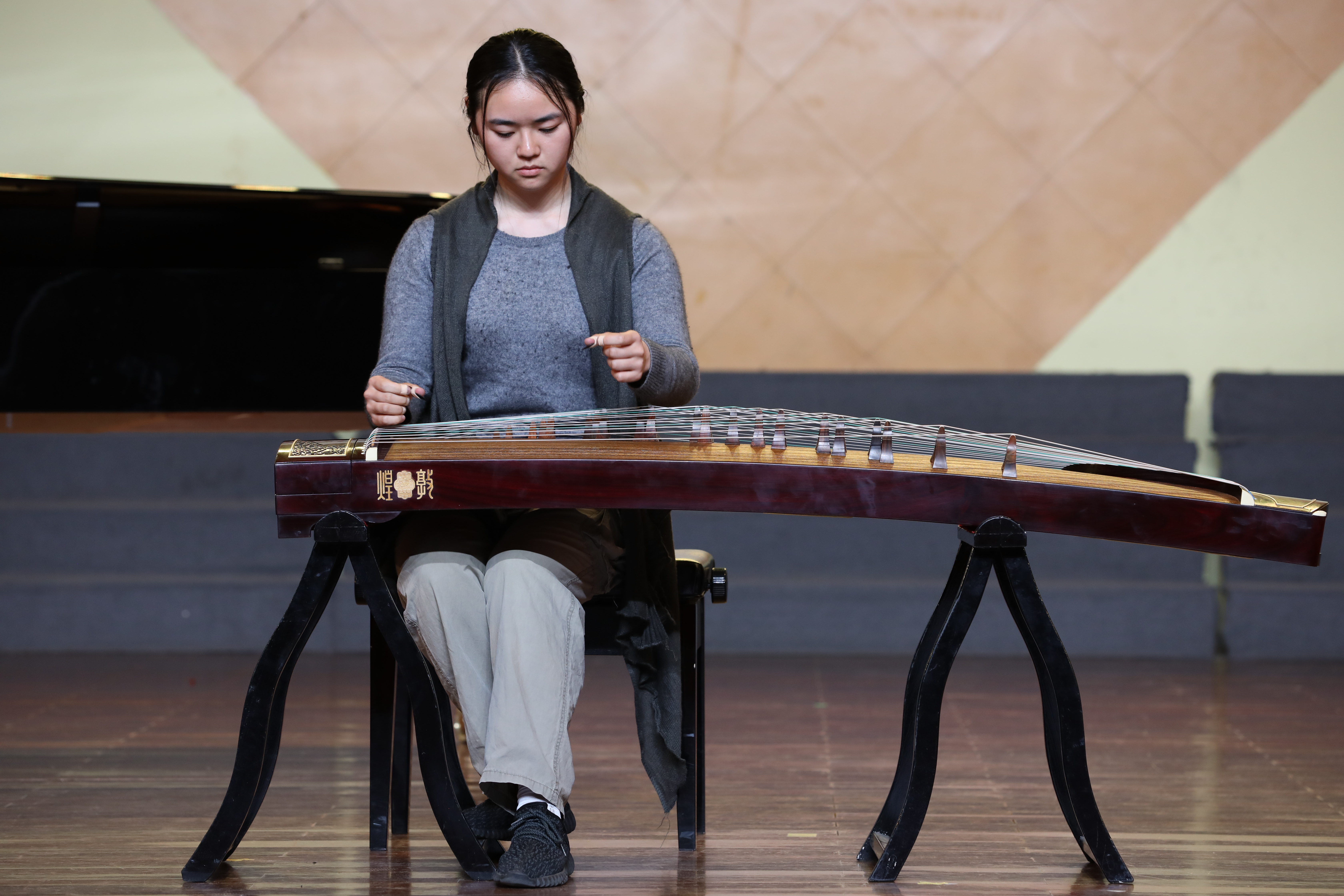 11日下午,参赛选手开始在浙艺音乐厅进行争分夺秒的走台训练,每人只有五分钟时间。走台中,古筝、琵琶、杨琴等一一亮相,还有各类伴奏锦上添花。琵琶曲抑扬顿挫,犹如白居易《琵琶语》中的描绘,时而“大弦嘈嘈如急雨,小弦切切如私语”,时而“银瓶乍破水浆迸,铁骑突出刀枪鸣”。每位参赛选手都非常认真,指导老师们在做最后的调整和努力。有位指导老师表示:“虽然排练已久,但看到自己的学生在舞台上弹拨古筝的时候,自己的心也会跟着紧张”。