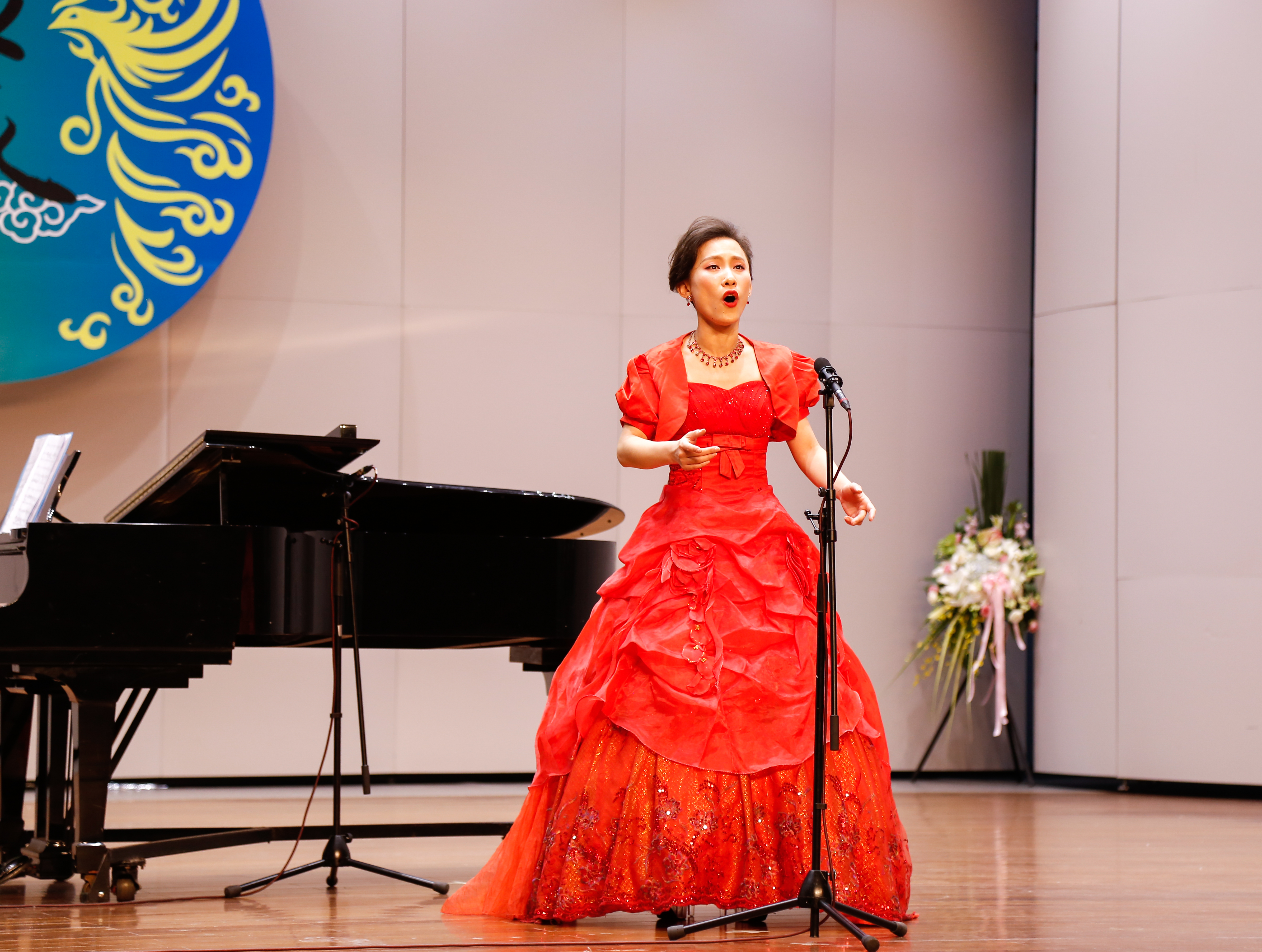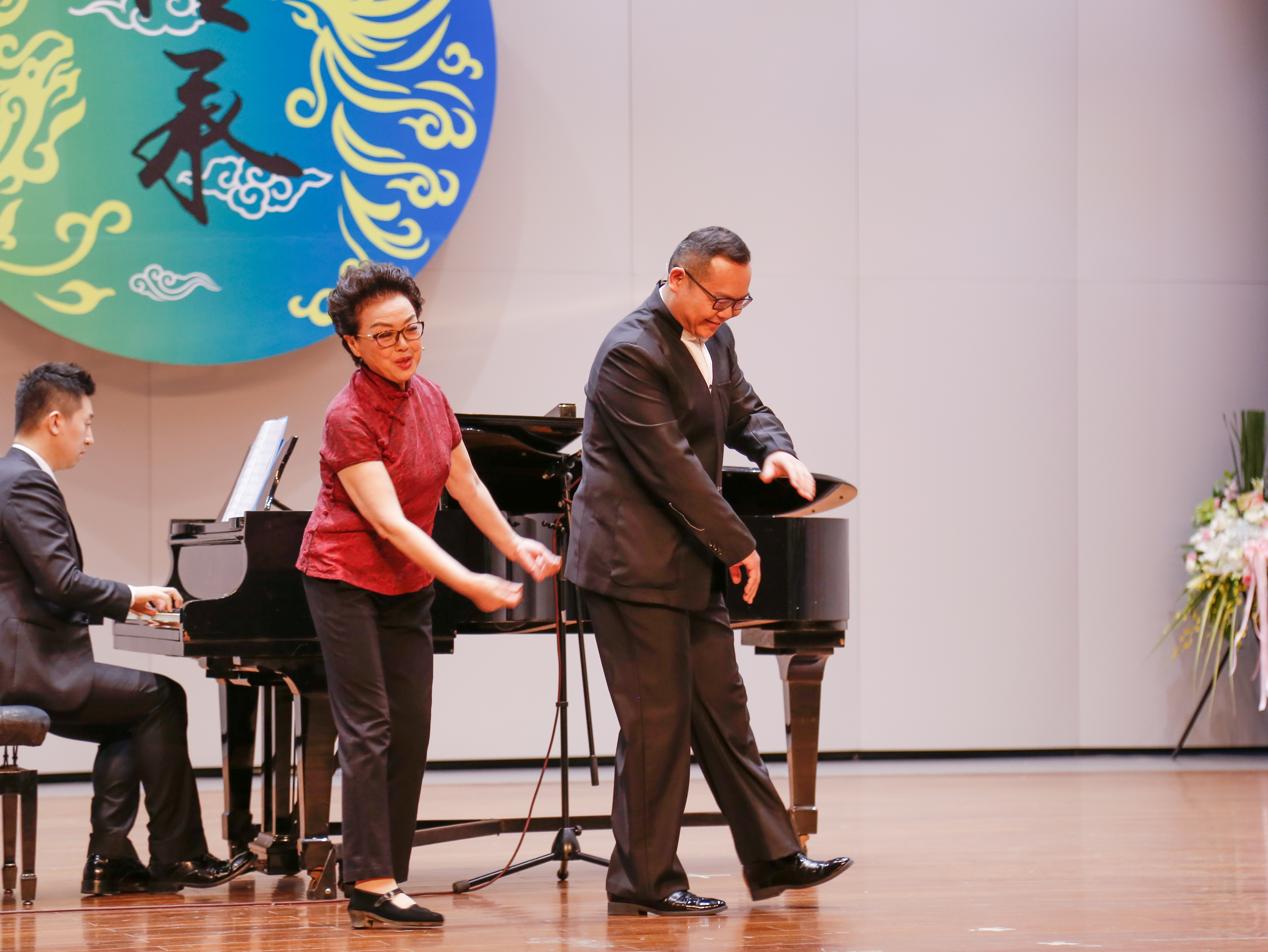 当晚浙江音乐厅大堂变成了花的海洋,花篮摆成了一条“花毯”,满眼望去都是祝胡素银音乐大讲堂暨师生音乐会圆满成功。胡素银为国家一级演员,第八届、九届浙江省政协委员,中国音乐家协会会员,浙江省音乐家协会声乐专业委员会顾问。曾是民盟浙江省委会委员,2005年11月荣获文化部“第七届区永熙优秀音乐教育奖”。对民族音乐文化和音乐表演艺术的执着,是70多岁的胡素银一直坚守与传承的。音乐会伊始,她提到中共中央办公厅、国务院办公厅印发的《关于实施中华优秀传统文化传承发展工程的意见》,就像一面旗帜,让她有底气在大讲堂上和大家交流中华民族优秀传统文化传承。传承发展工程最重要的是“人”,是教育,立德树人是根本任务。这就是讲座名称的由来。胡素银从1987年调入浙江艺术学校(现为浙江艺术职业学院)越剧科担任声乐老师讲起,讲述了一路走来,面对不同学生不同嗓音条件的开发,音乐教育理念在一代代学生身上的呈现,向观众传递民歌知识,讲述民歌故事。她说,自己一直以来坚信,做难事必有所得。民歌,需要有人记住,有人欣赏,有人传承。在这个时代,机会来了。