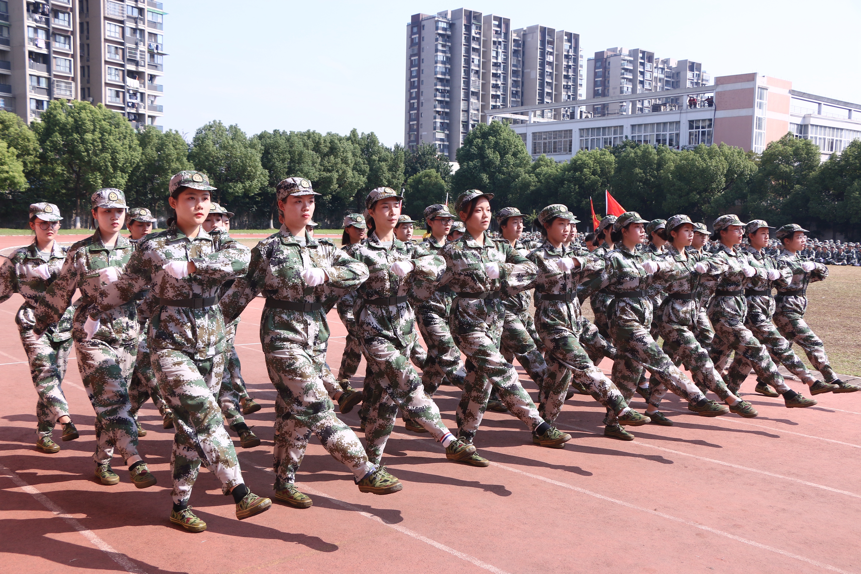 《义勇军进行曲》响起,全体新生用坚定的眼神凝望五星红旗缓缓升起,闭训仪式随即拉开大幕。党委副书记夏开堂代表学院党委检阅了新生军训队伍。各营排进行分列式军训汇报,“提高警惕,保卫祖国;扬帆把舵,奋勇拼搏,看我一排,气势磅礴;牢记担当,百炼成钢,再创辉煌……”,嘹亮的口号声在田径场上空回荡,这是发自内心的声音,响彻天空。经过军训的洗礼,同学们步伐有力、英姿昂扬,将这半月所学所练一一展现。方阵表演吸人眼球,军体拳表演、队列表演、战术表演,这支由各系最精英的成员组成的方阵,以精湛的军训动作展示,向老师和同学们致敬。