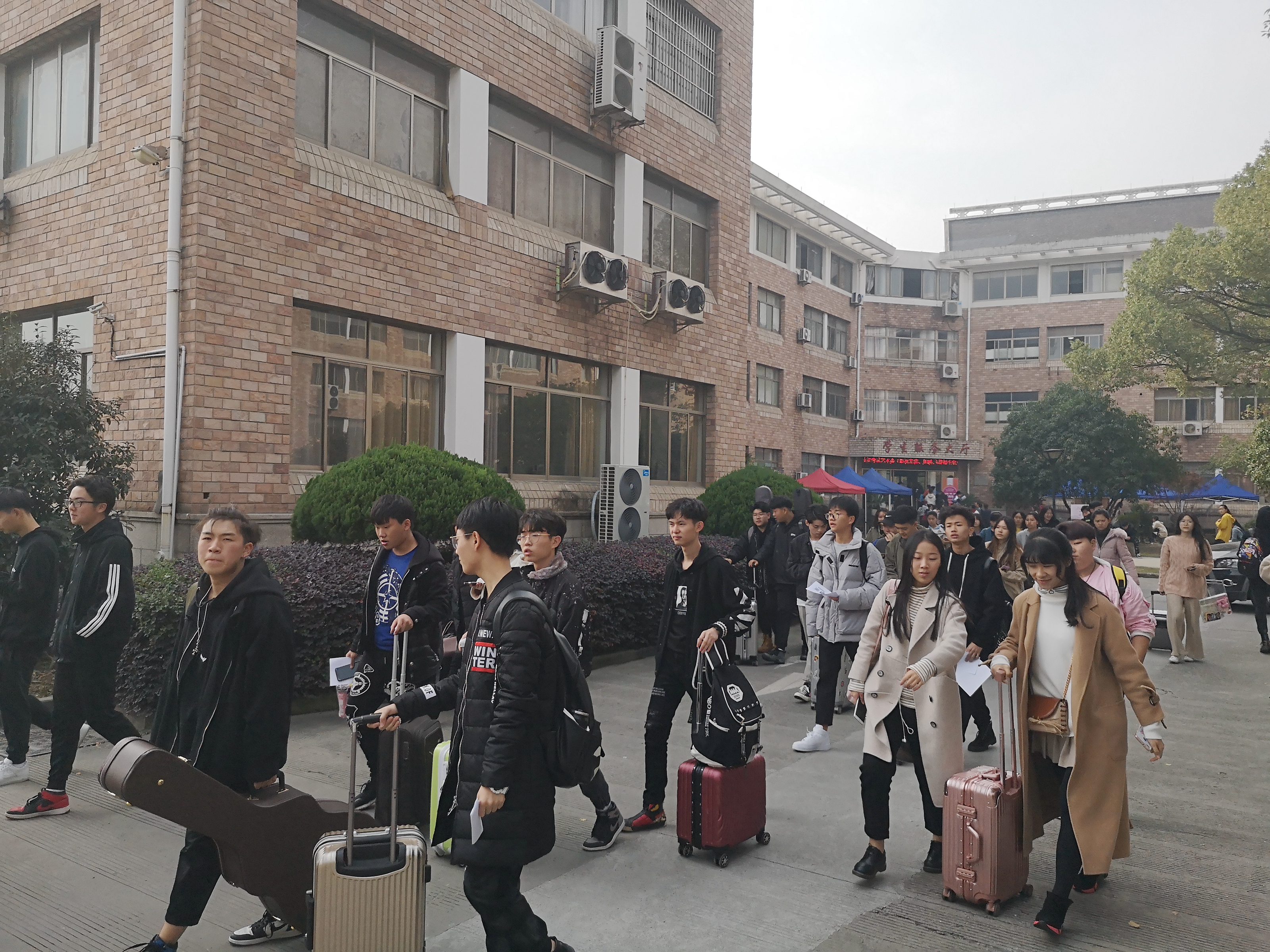 秋冬时节的浙艺校园,金黄色格外醒目,中心广场两旁的银杏树将落叶洒落在脚下依然青青的草坪和蓝色的步道上,给冬日里的校园增添了几分温暖。今天(30日)是考生们报到的日子,一进校园,本次考试的导示牌便映入眼帘,交代了报到、候考、考场等具体信息。早晨刚开始时报到人数还不多,临近中午时出现了高峰期。考生们带着身份证、职业技能考试报名证等证件进行现场确认。