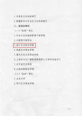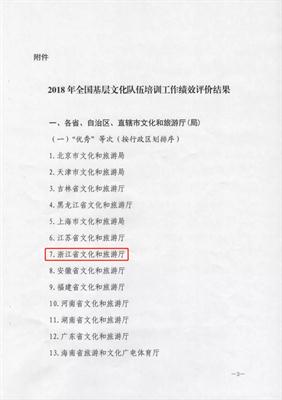 近日,文化和旅游部公共服务司通报了2018年全国基层文化队伍培训工作绩效评价结果,浙江省文化和旅游厅、浙江艺术职业学院双双获评“优秀”等次。这也是文化和旅游部自2016年实施绩效评价工作以来,我校连续三年被评为“全国基层文化队伍培训工作优秀单位”。今年除了国家培训基地外,我校位列各省市基地第一。