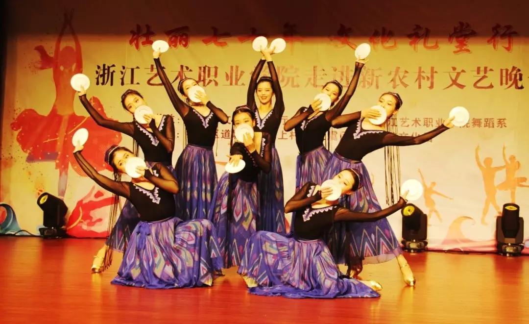 11日晚,舞蹈系“壮丽七十年 文化礼堂行”文艺晚会在钱上村文化礼堂拉开序幕。晚会以独特的民族舞《古扎丽古丽》开场,展示新疆姑娘们似火的热情和别样的风情。