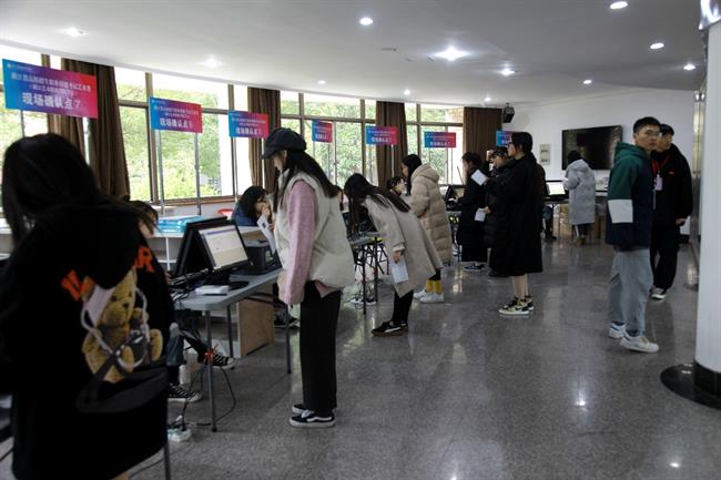 初冬的寒冷抵挡不住考生们的热情,一大清早就有考生前来排队。考生随着银杏叶铺成的金黄色小道走进报到现场,布告栏上写着考试温馨提示,交代了考试规则、考生守则、考生须知等信息。
