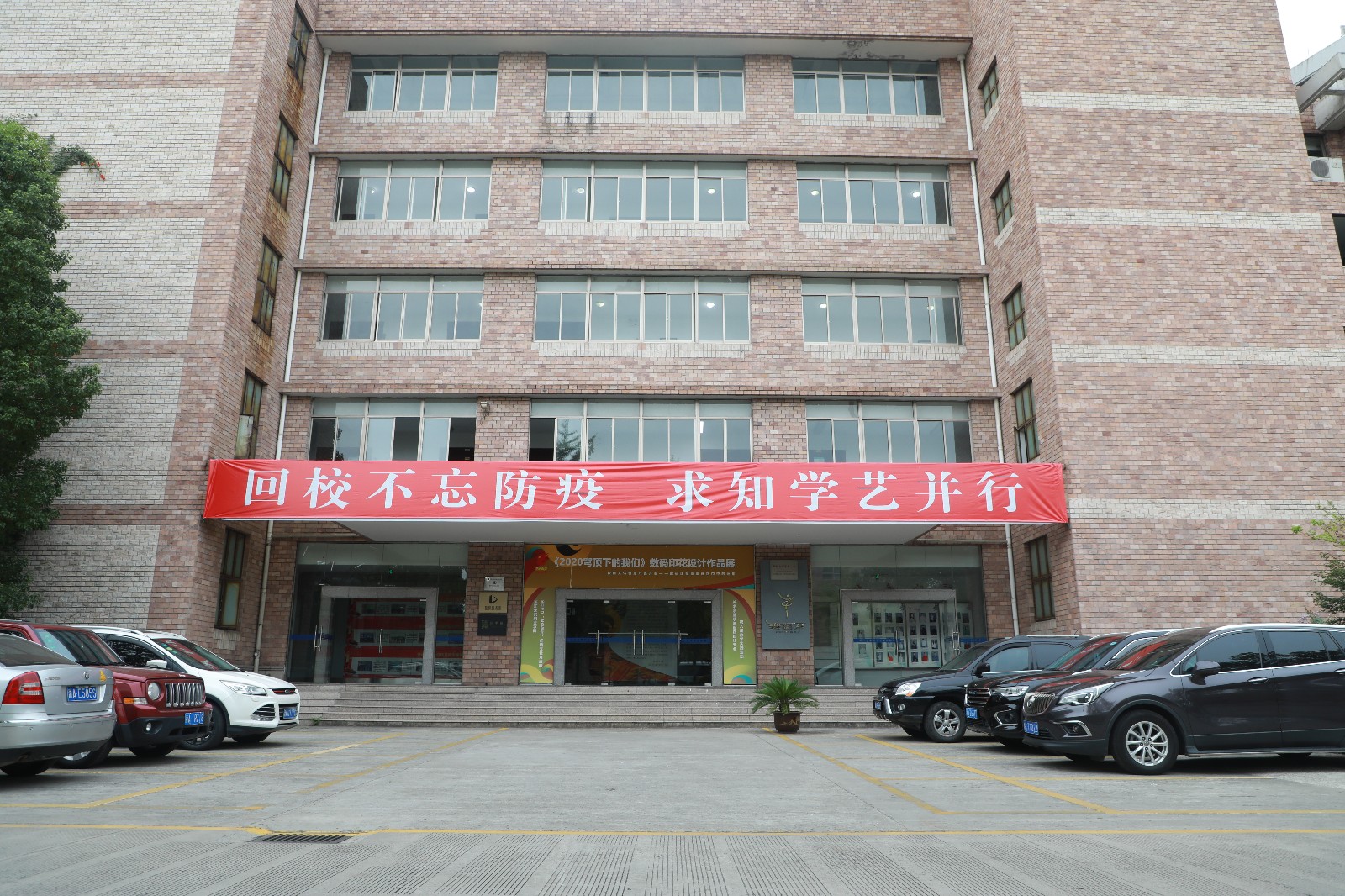 走进校门,四号楼展厅门口张贴的横幅写着:“回校不忘防疫,求知学艺并行。”新学期新气象,但也不要忘记疫情的防控噢~