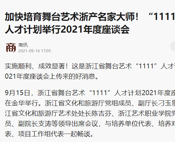 9月15日,“1111”人才计划2021年度座谈会在金华举行。浙江省文化和旅游厅党组成员、副厅长刁玉泉,浙江省文化和旅游厅艺术处处长陈吉芬等出席会议,与培养单位代表、培养对象代表、项目工作组代表一起座谈。