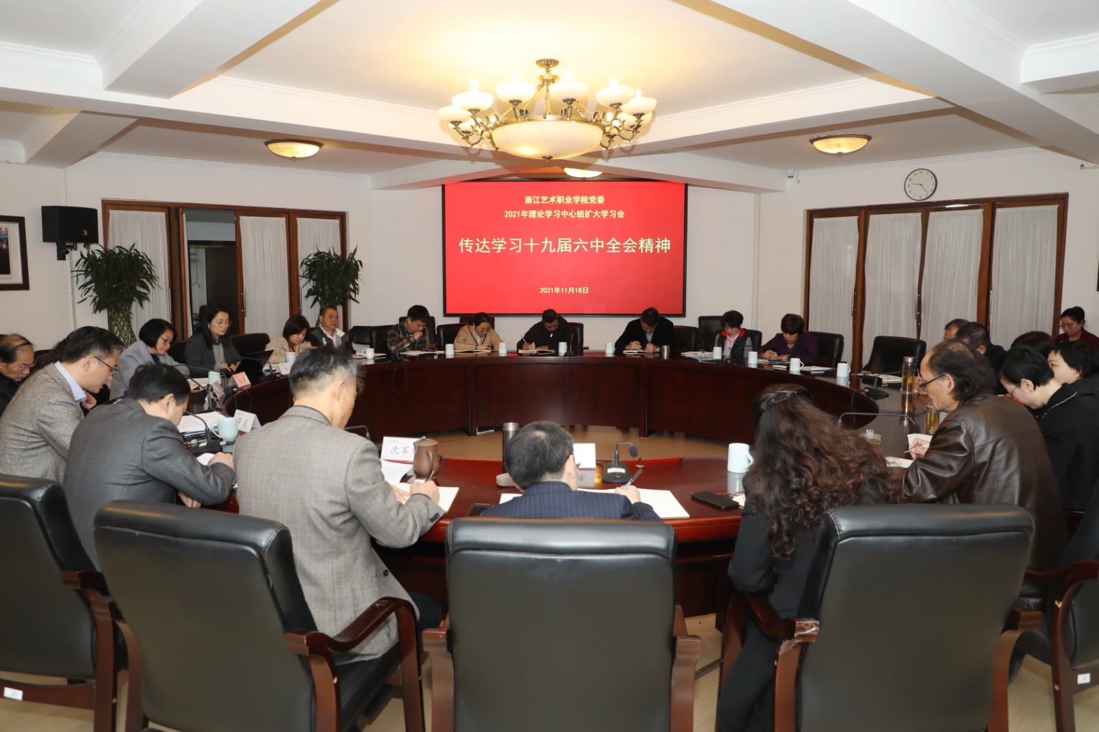 薛亮领学了《中国共产党第十九届中央委员会第六次全体会议公报》,传达了全省领导干部会议和浙江省委学习贯彻十九届六中全会精神“六讲六做”大宣讲活动动员部署会的相关精神,为学校进一步做好学习贯彻落实发出了动员令。