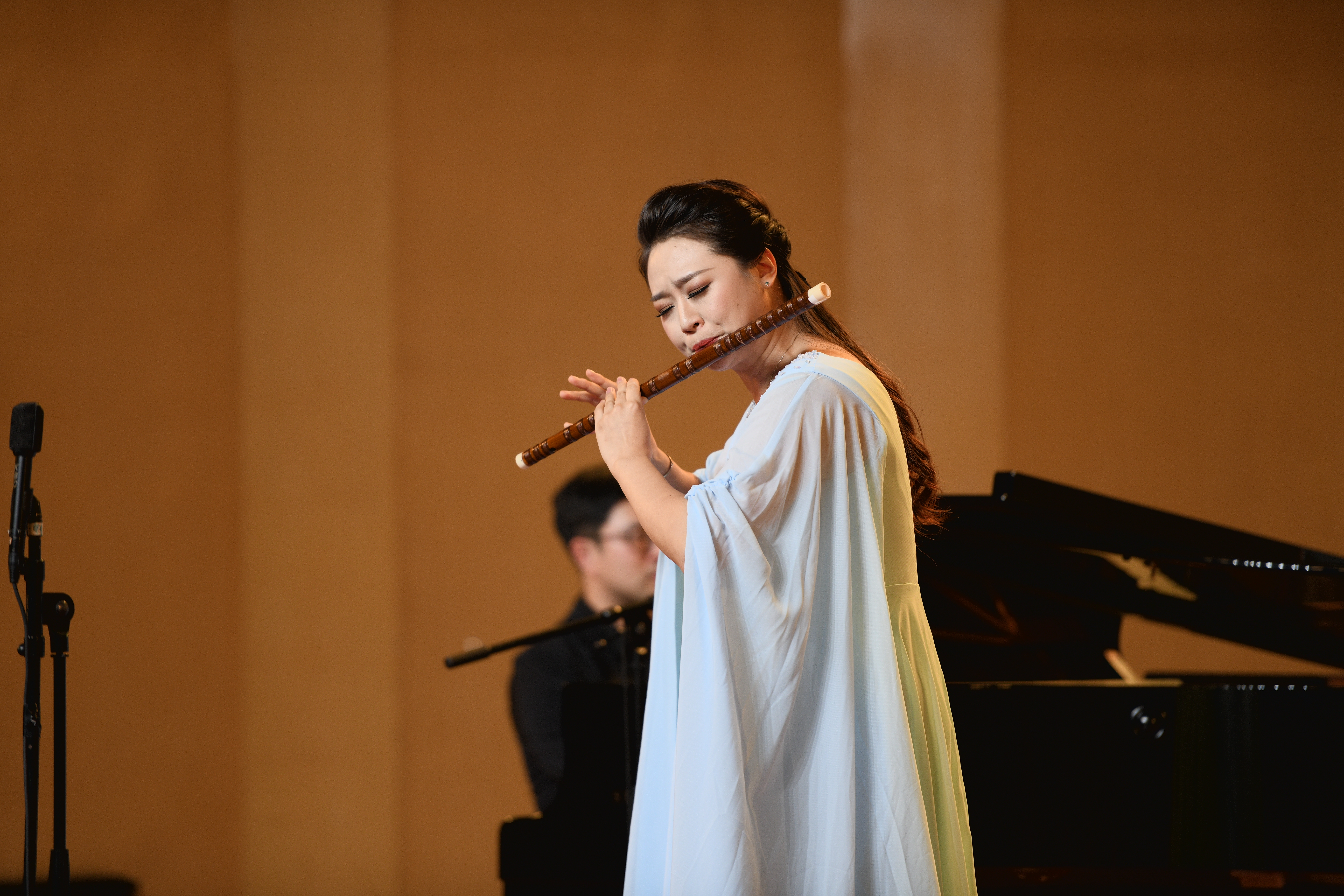 我校音乐系竹笛专业教师常轶伟带来了一首充满西域风情的《胡旋舞》。该曲由台湾作曲家钟耀光作曲,原是一首西洋长笛曲2010年经中央音乐学院博士生导师戴亚教授改编后作为当年台北笛子大赛决赛规定曲目,是目前笛曲中技术难度较大的作品。作为浙艺音乐系民乐教研室青年教师代表的常轶伟,自2020年荣获“新松计划”浙江省青年演奏员大赛吹奏组一等奖后,此番再度亮相舞台,带来了精彩纷呈的出色演绎。