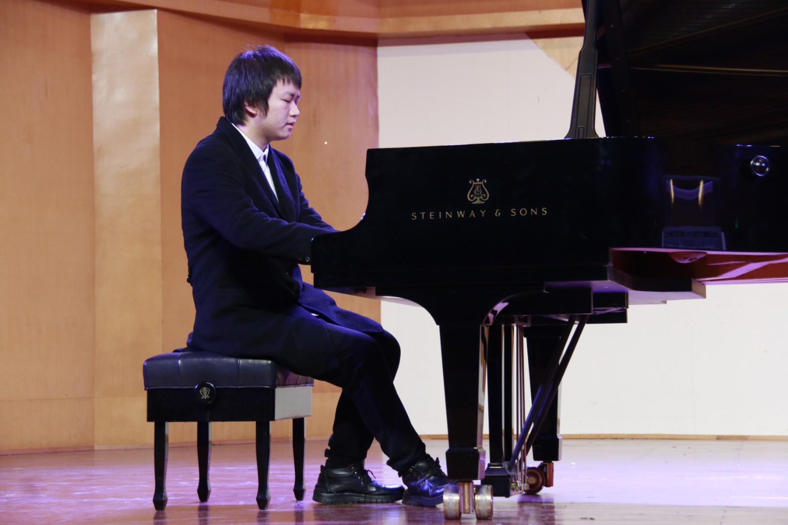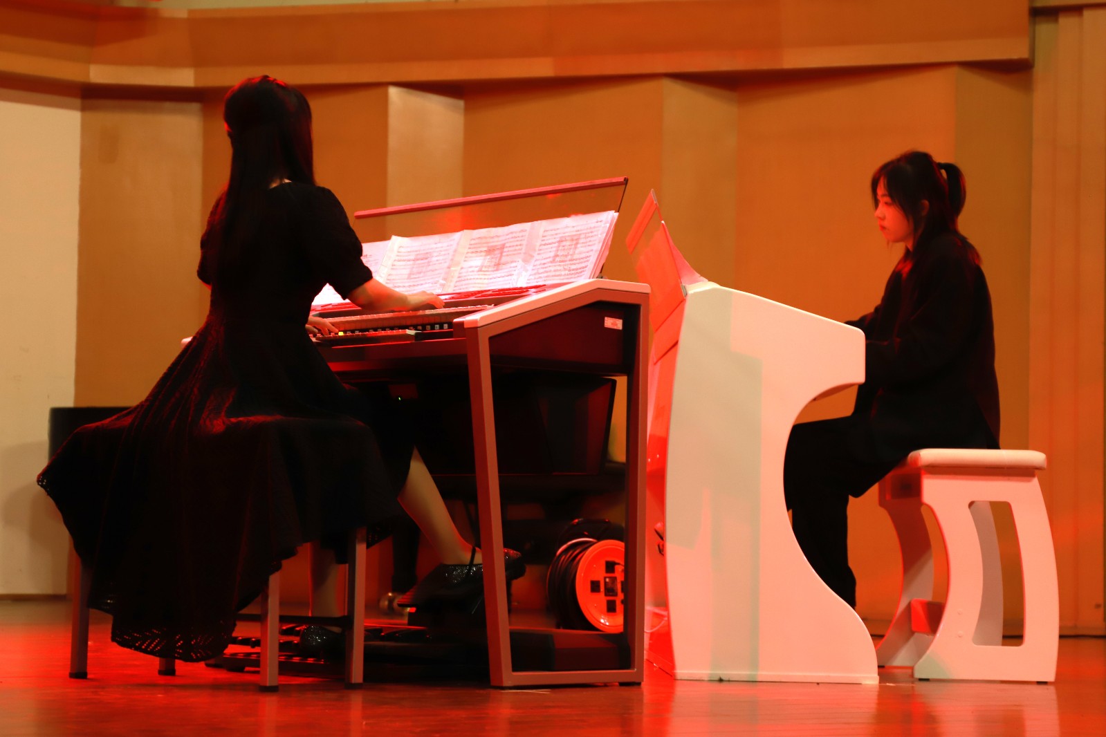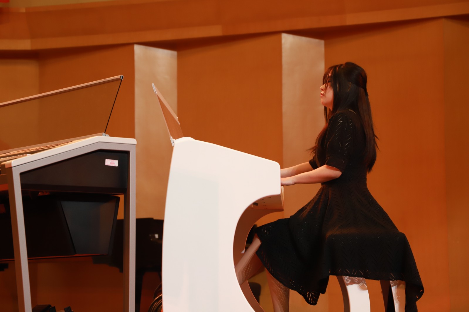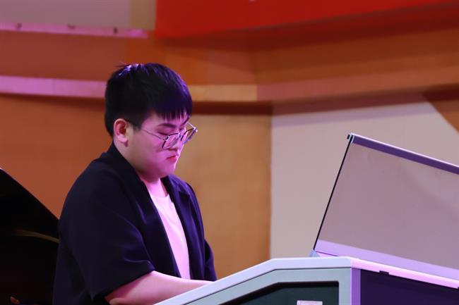 在蓝紫色的灯光下,陈姿羽用双排键电子琴给大家带来了一曲《伊戈尔王-鞑靼人之舞》,琴声时而热情洋溢,时而沉闷有力。陈星伊用一曲《敦煌随想》带听众们走进了浪漫而又神秘的敦煌。周玛莉将律动与和声进行了巧妙组合,一首《彩》让大家置身于绚烂多姿的光影幻境中。龚煜城技术娴熟,带来的《交响舞曲第三乐章》,节奏忽快忽慢,带给观众们别样的听觉感受。李诺舟准确的把握住了莫什科夫斯基《西班牙随想曲》中浓浓的西班牙式节奏感和特殊的和声走势。魏洲将普罗科菲耶夫《罗密欧与朱丽叶》的主题冲突把握的很有分寸,具有戏剧性效果。王子田的肖邦《平静的行板与大波兰》华丽而庄严,平静却不失张力。