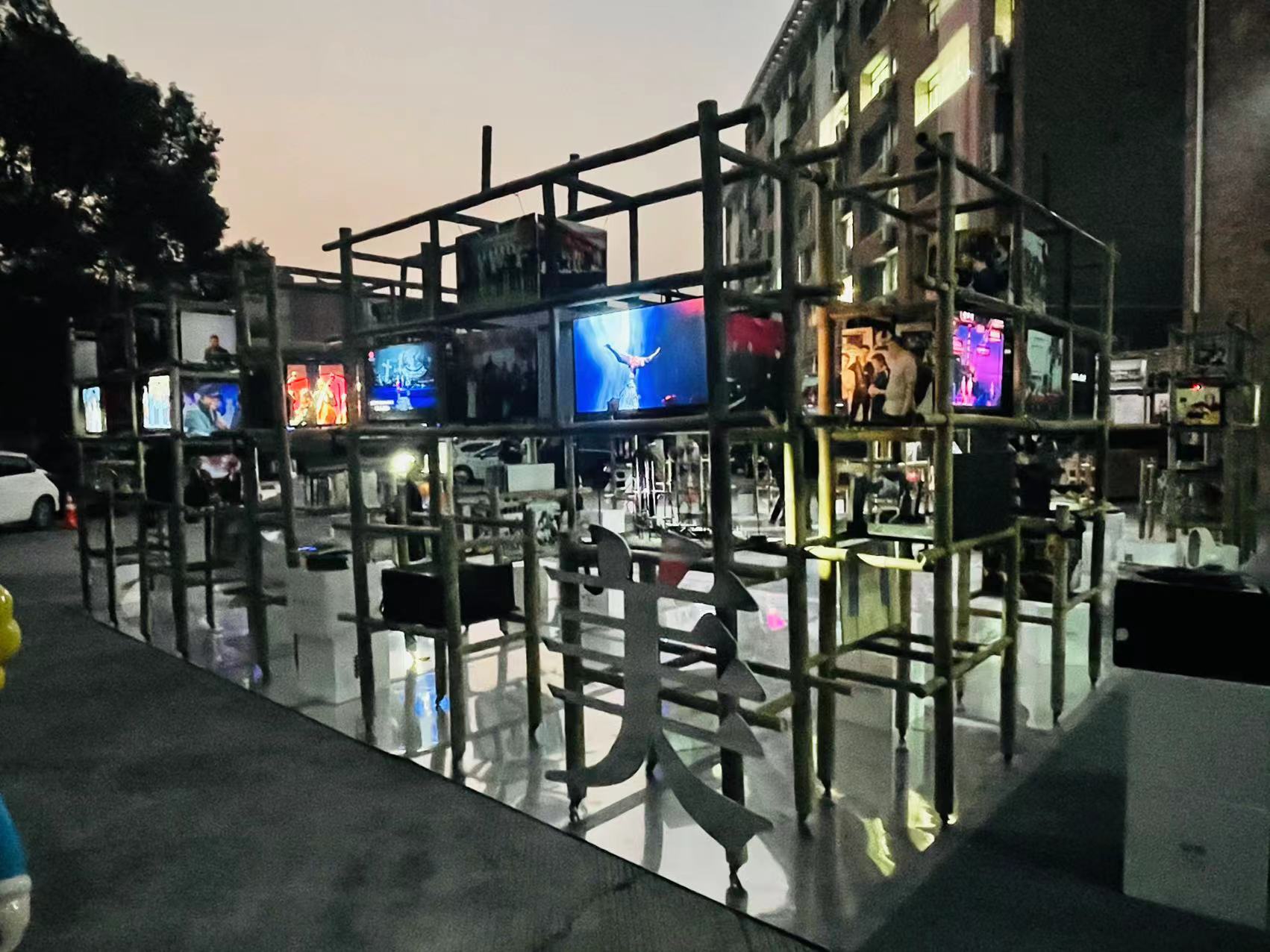 展览以“绿水青山”为主题,用长在浙江安吉的原生态竹子为材,以“镜面”为倒影,作为“水”来呈现山、水、竹一体的画面,参展作品被安置在十个可以移动的三米多高的“竹山”上,以浙江舞美学会的徽标为基础,延伸设计搭建出了“舞美”二字的形状,每个竹架都可单独作为一道风景在展馆内移动,合则一片生机,离也一枝独秀,并赋予了每座“竹山”不同的使命和功能,体现了浙江舞美人希望走出去与外界互动的意愿和姿态,同时也体现了浙江一贯倡导的“窗口”意识,透过文化看世界。