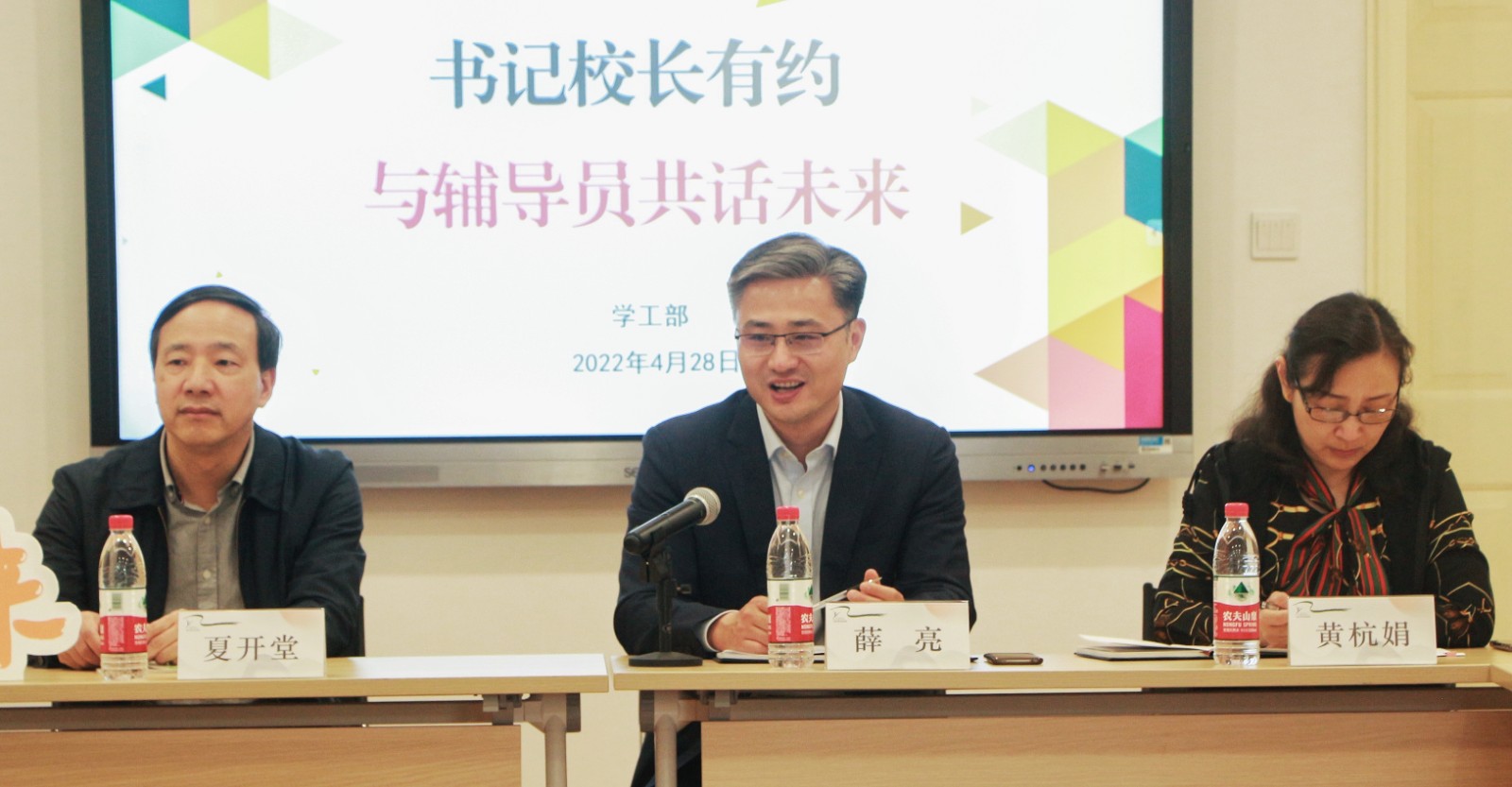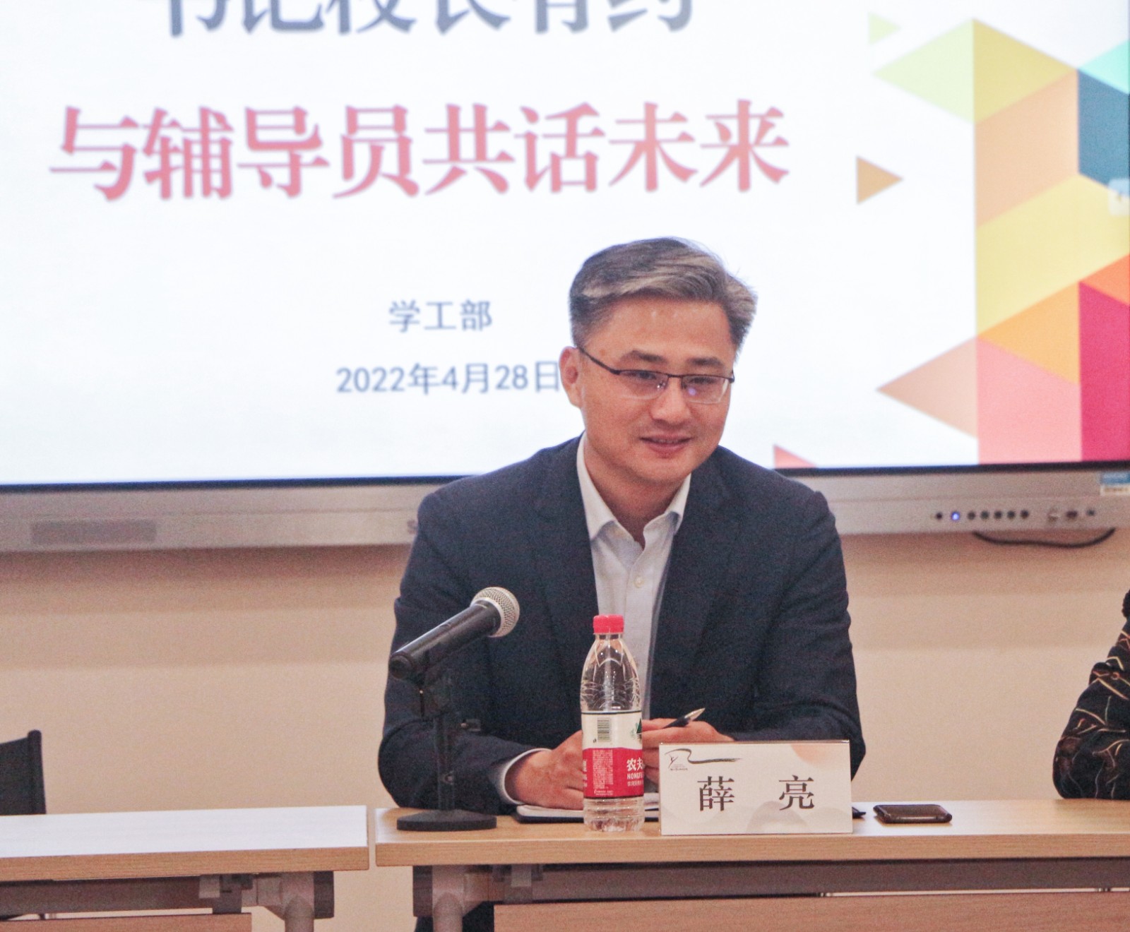薛亮对辅导员们表达了“五四”青年节的问候。他表示,辅导员是教师队伍中最年轻、最富朝气的力量,是学生成长路上最重要的角色之一。打造一支结构合理、本领高强的专业化辅导员队伍一直是我校努力的目标。在校园疫情防控期间,辅导员队伍始终坚守一线,与学生同吃同住同向同行,为保证校园稳定和教育教学正常开展做出了贡献。他代表学校党委向辅导员们表示感谢,也勉励大家坚守初心,在不断成长中实现职业理想。