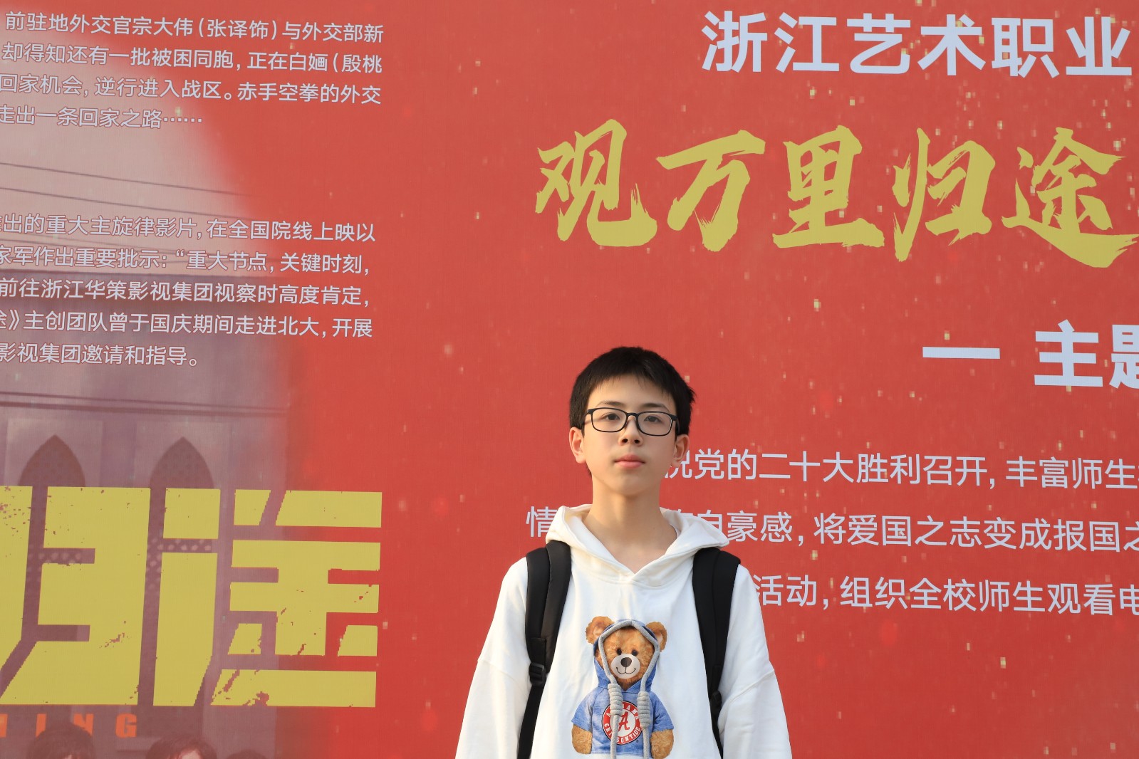 为庆祝党的二十大胜利召开,丰富师生校园文化生活,增强广大师生爱党爱国爱社会主义情怀和民族自豪感,10月23日至27日,浙江艺术职业学院举办喜庆二十大“观万里归途,知根在何处”主题活动,组织全校师生观看电影《万里归途》,开展影评体会征集宣发等系列宣传教育活动。活动由浙江华策影视集团指导,浙江艺术职业学院党委宣传部主办,浙江艺术职业学院各二级党总支(直属党支部)、浙江实验艺术剧场协办。