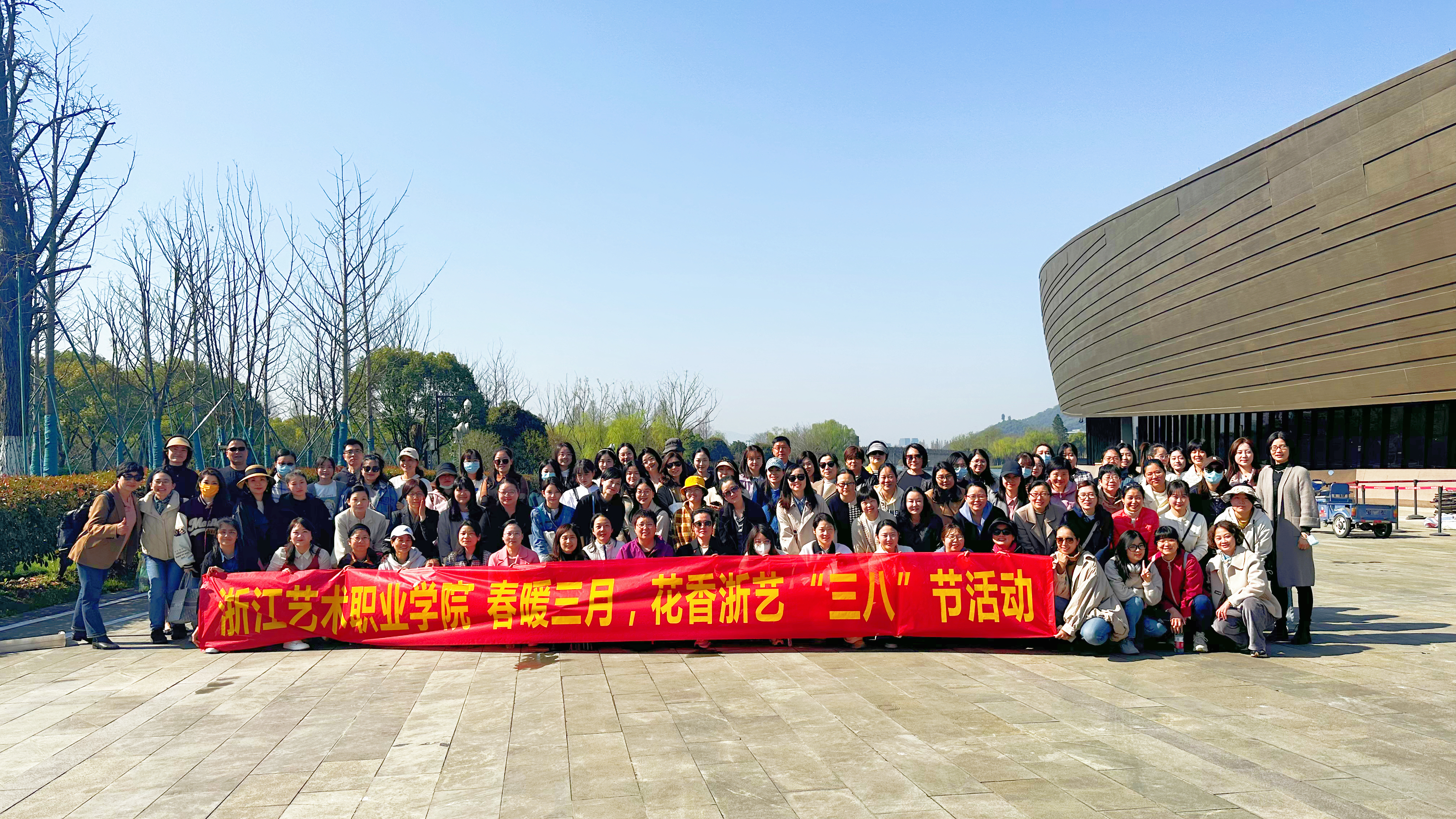 三月三日天气新,长安水边多丽人。春暖花开,从古至今就有赏春踏青传统。浙江艺术职业学院今年的“三八”妇女节活动,3月14日在湘湖水边举行,主题为“春暖三月,花香浙艺”,全校约200位女教职员工参加。