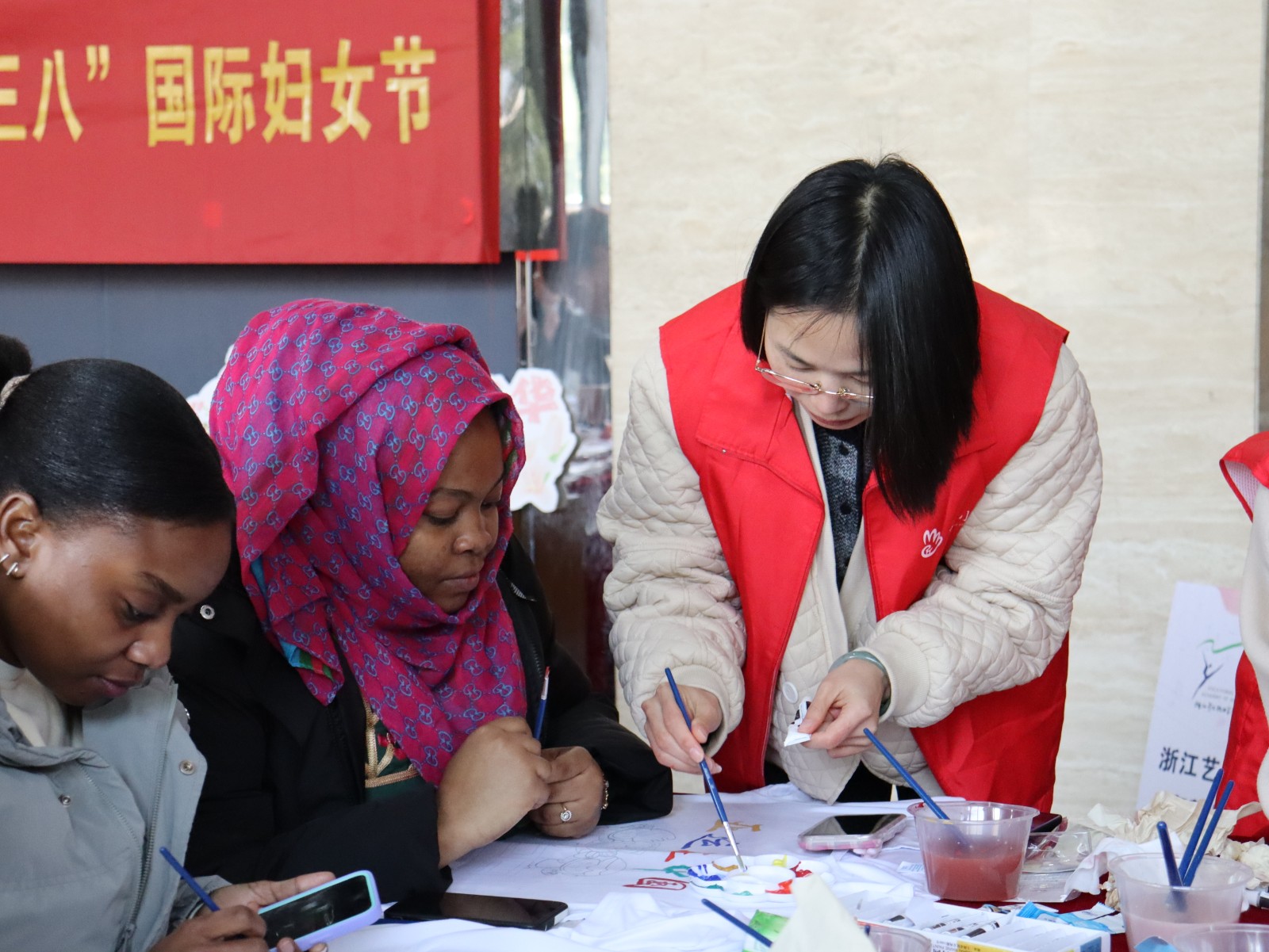 亚运情、巧手意,恰逢女神节,在喜迎亚运的浓厚氛围里,近日,“文艺星火赋美”工程志愿者、浙江艺术职业学院手工艺学院“艺小匠”们携手东信社区,举行“凝聚她力量·风采亦飞扬”庆祝“三八”国际妇女节暨为亚运添彩主题活动,与外国友人共绘亚运,共舞未来,让女性同胞们感受美、欣赏美、体验美,为杭州亚运会贡献“她力量”。