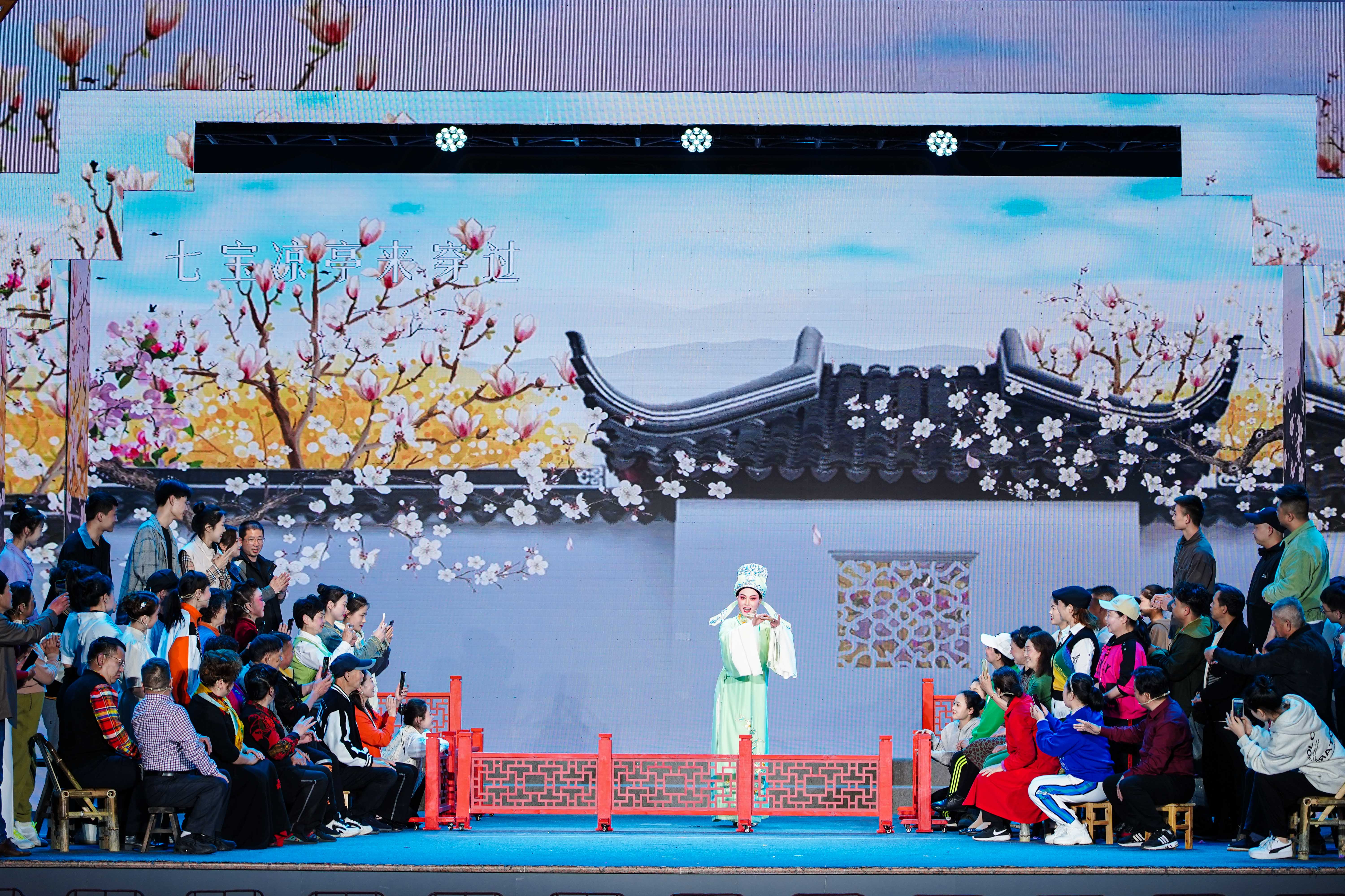 演出在戏曲荟萃《春色满园》中拉开了序幕。随着戏曲情景剧《看戏》、越剧折子戏《梁祝•十八相送》、越剧现代戏《君子成忠•成婚三日情意浓》、戏剧情景剧《逗戏》、多剧种折子戏《断桥》、台州乱弹现代戏《我的芳林村• 分红》等轮番亮相,现场观众的情绪变得高涨,不少老戏迷们一边跟着节奏打节拍,一边随着台上演员哼唱几句。演员们生动传神的扮相、惟妙惟肖的表演、婉转优美的唱腔把戏曲人物刻画得淋漓尽致。精彩纷呈的演出和美轮美奂的舞台效果获得了满堂喝彩。演出间隙,部分剧团团长、演员、非遗传承人代表受邀上台,分享了办团经验、热爱戏曲坚守初心的历程和戏曲传承创新的实践经验,让老百姓更进一步了解了民间文艺表演团体这个群体。