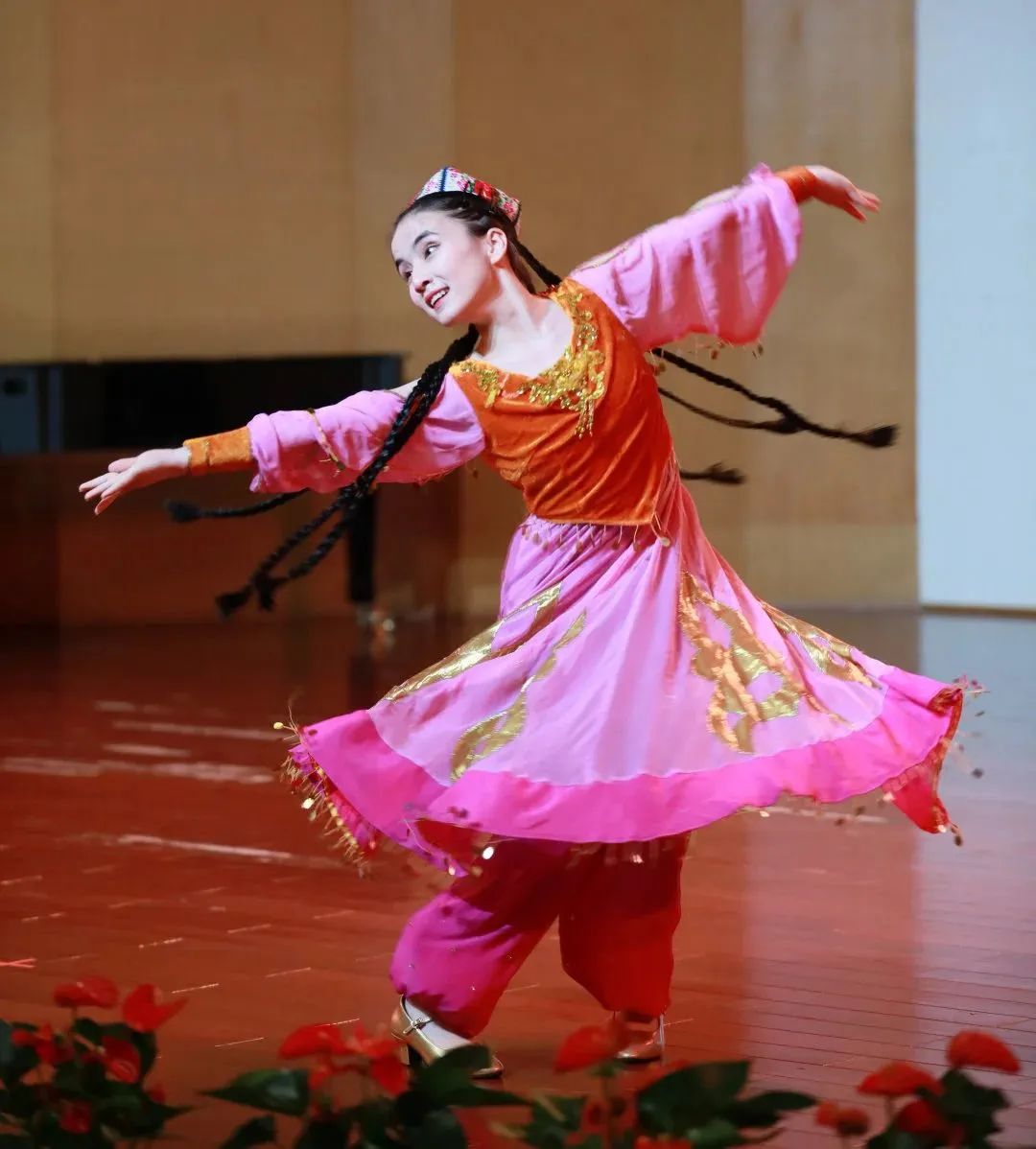 玉米提同学演绎了小提琴独奏《花儿为什么这样红》,熟悉的旋律经玉米提同学的演奏韵味十足,运用西洋乐器充分表现了新疆的音乐风格。在舞蹈学院学习的祖拜代·艾麦尔身着新疆传统服饰,表演了一段极具特色的独舞《阿图什》。全体演奏人员共同演绎了一首展现多民族和谐共处和对祖国深情祝福的器乐合奏曲《昆仑之春》,音乐会在欢腾的旋律、热烈的舞蹈中落下了帷幕。