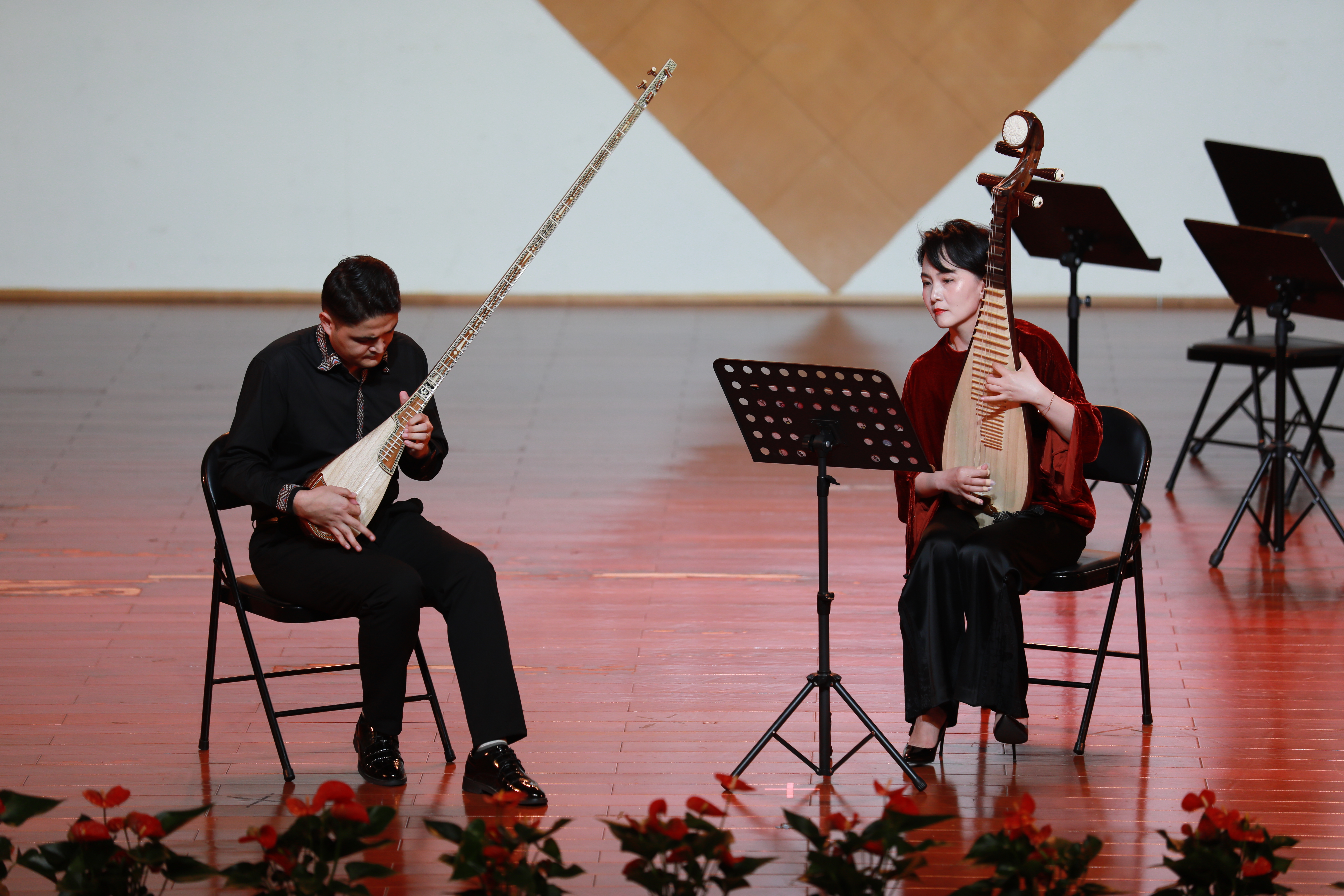 音乐学院琵琶教师赵瑾作为西尔扎提江在浙艺的导师,用弹布尔演奏了新疆风格作品《牡丹汗》。赵瑾还与西尔扎提江合作演奏了弹拨乐作品《艾介姆》,该演奏版本是在弹布尔和琵琶独奏谱的基础上,由两位老师改编而成。表演充分体现了此次活动合作、交流、共建的意义。赵瑾说:“教学相长,三个月中与西尔扎提江老师互相学习,琵琶和弹布尔有同宗同源的关系,能够学习新疆最具代表性的弹拨乐器,将会在琵琶上表现新疆音乐作品时更加凸显它的风格性。”