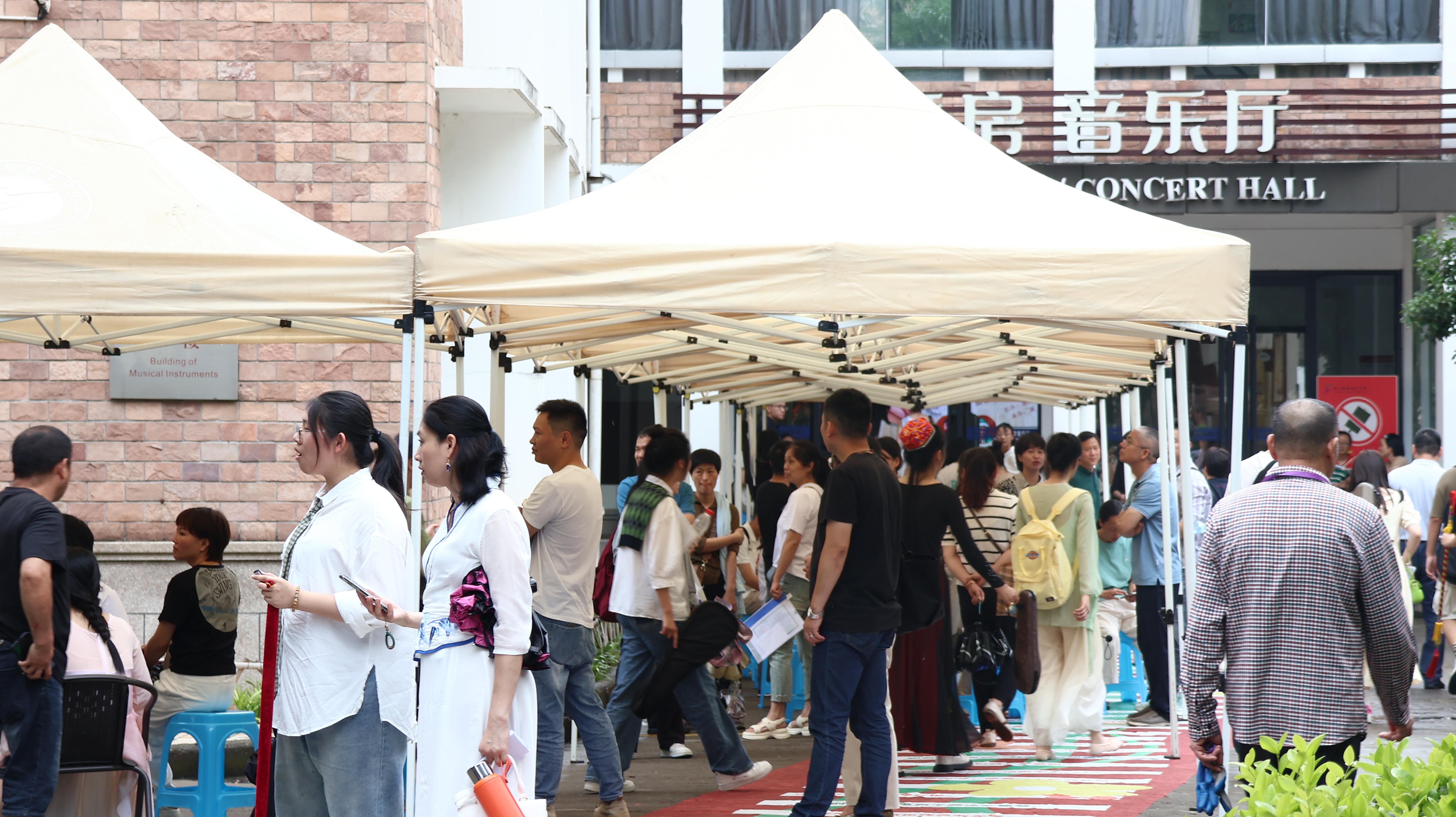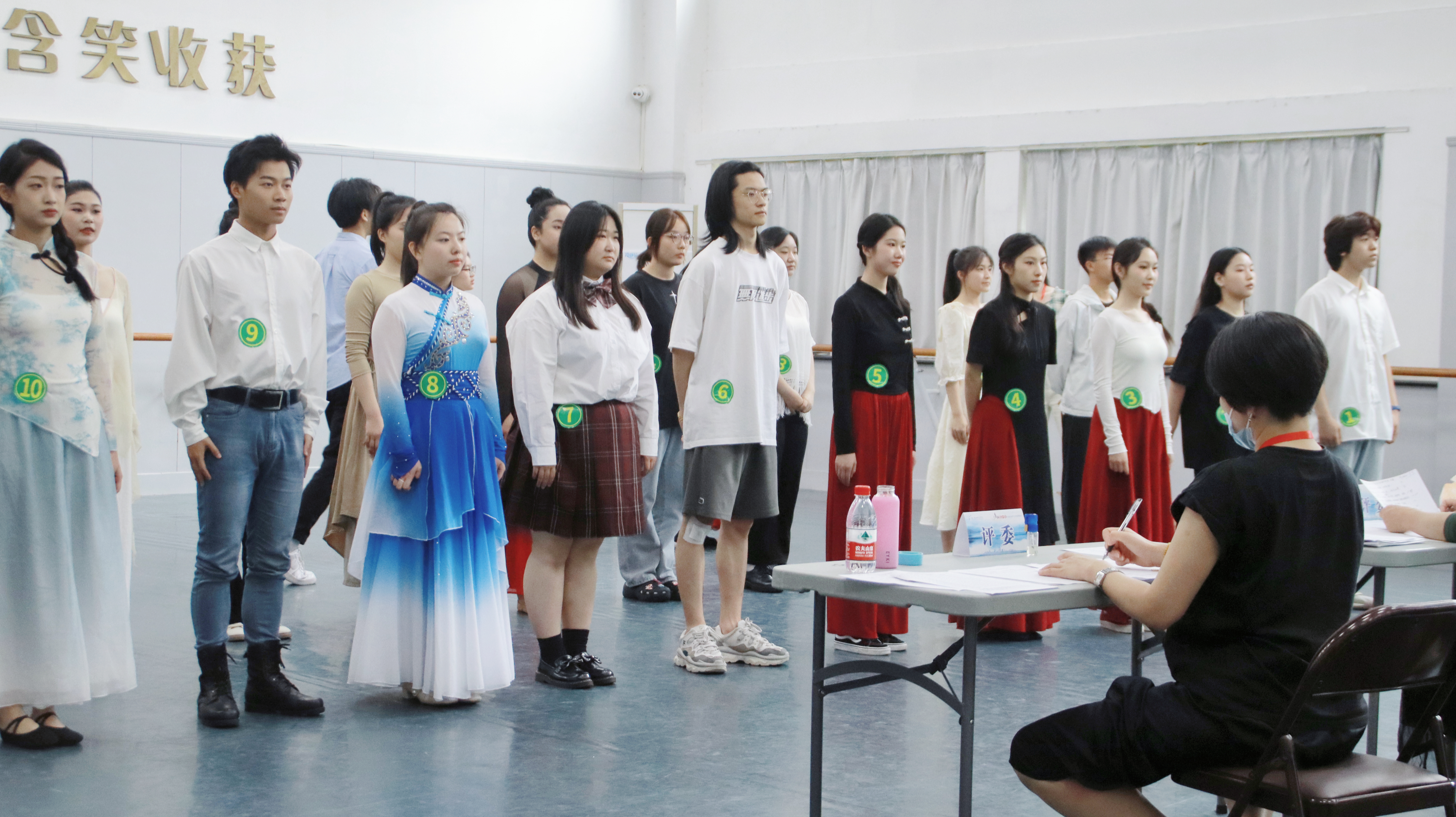 在候考教室内的考生抓紧为考试做最后的准备。有的站在窗前开嗓,有的认真检查乐器,有的面对镜子仔细检查穿戴服饰……专业测试时,考生按地区分组在学生志愿者的带领下井然有序进入考场,考官通过声乐、语言、形体、才艺展示等进行评分。现场,有的同学演唱流行音乐,有的同学进行无伴奏清唱;有的将一段寓言故事娓娓道来,有的声情并茂地朗诵诗歌;形体展示有武术、舞蹈等,跨度大,难度高;才艺展示中,有架子鼓表演,也有书法、国画展示。考生们有条不紊、神采奕奕,尽力将自己最优秀的一面展现在考官面前。