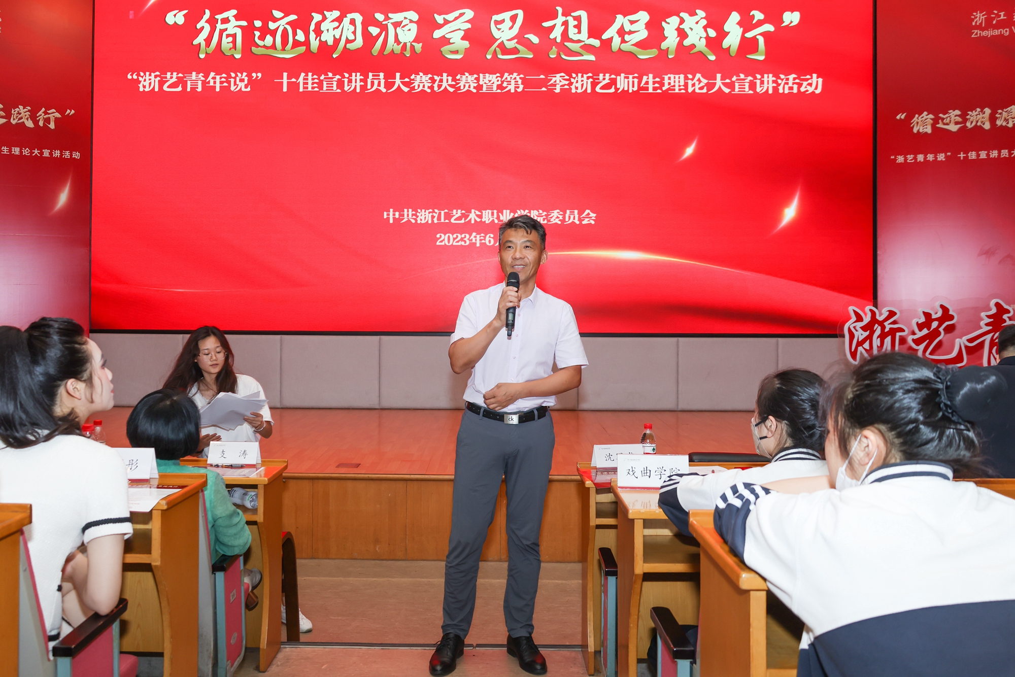 6月13日晚,“循迹溯源学思想促践行”“浙艺青年说”十佳宣讲员大赛决赛暨第二季浙艺师生理论大宣讲活动在图信中心报告厅举行。校党委委员、副院长沈军甫,党委委员、副院长支涛,党委委员、宣传部(统战部)部长马向东,相关职能部门和各二级学院负责人出席并担任评委。各二级学院学生代表到场听取宣讲。