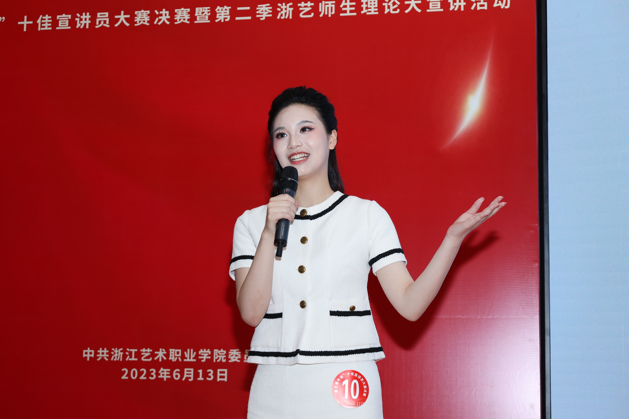 本次宣讲员比赛活动是浙江艺术职业学院学习贯彻习近平新时代中国特色社会主义思想主题教育的一项重要活动,通过青年师生主题宣讲,引导全校师生深入学习贯彻习近平新时代中国特色社会主义思想和党的二十大精神,从中汲取进取的智慧和力量,自觉接受思想淬炼和精神洗礼,在不断强化理论武装的过程中筑牢信仰之基,补足精神之钙,把稳思想之舵。