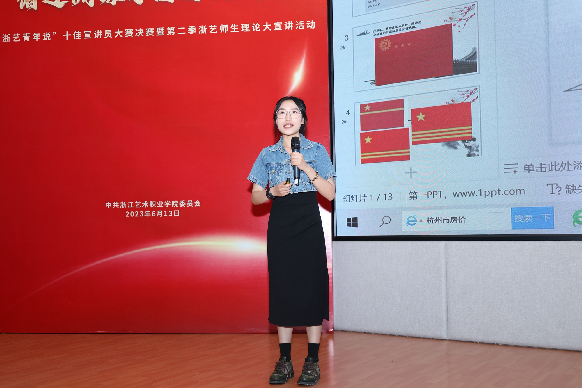 20位师生宣讲员从自身经历出发,用生动的案例、感人的故事从不同视角阐述浙艺人在时代脉搏中的勇敢担当。音乐学院教师宣讲员章璐从河姆渡文化切入,阐述在“八八战略”指引下,浙江从文化大省到新时代文化强省的发展历程,结合音乐剧《万事皆有可能》,号召广大青年在文化指引下,不怕挫折,勇敢奋进。舞蹈学院教师宣讲员严佳倩以雷锋精神为引子展开讲述舞剧《灯火阑珊处》幕后的故事,表达浙艺师生艰苦奋斗、无私奉献的“螺丝钉”精神。戏剧影视学院教师宣讲员李雨波通过讲述姚水娟、茅威涛等浙艺名师、校友的故事,激发在校学生用文艺的力量担起重任,干在实处,走在前列。校团委教师宣讲员吴梦静通过讲述自身志愿服务经历,展现了志愿服务中的青春力量。演艺与教育学院学生宣讲员赵芯瑶讲述了文化员定向班毕业生在基层投身文化服务的故事,鼓励大家要勇担文化新责,发出文化强音。手工艺学院教师宣讲员戚幸怡通过讲述手工艺学院师生在课堂学习、社会实践中走好“传承非遗 助力共富”的赶考路,表达了自己参与其中的收获和致力于传承发扬非遗文化的决心。比赛现场气氛热烈,精彩纷呈。宣讲员们在台上精神焕发,风采四溢,动情动听动人的宣讲感染了全场观众,掌声喝彩声此起彼伏,叫好声不断。