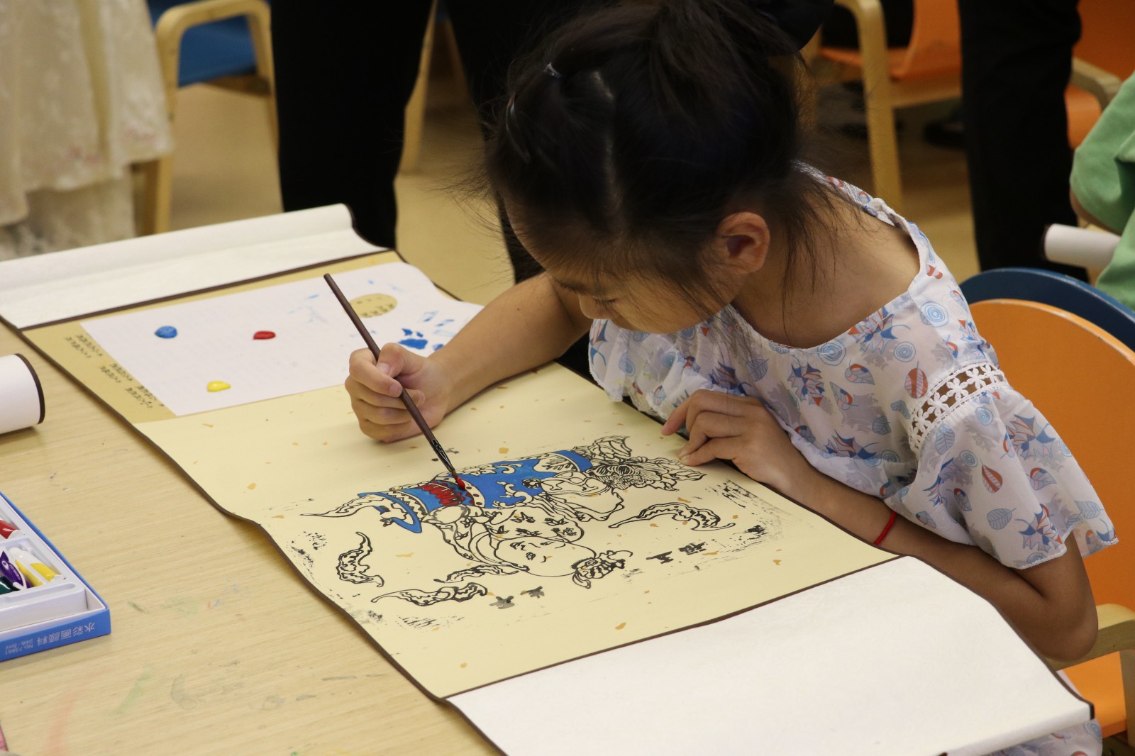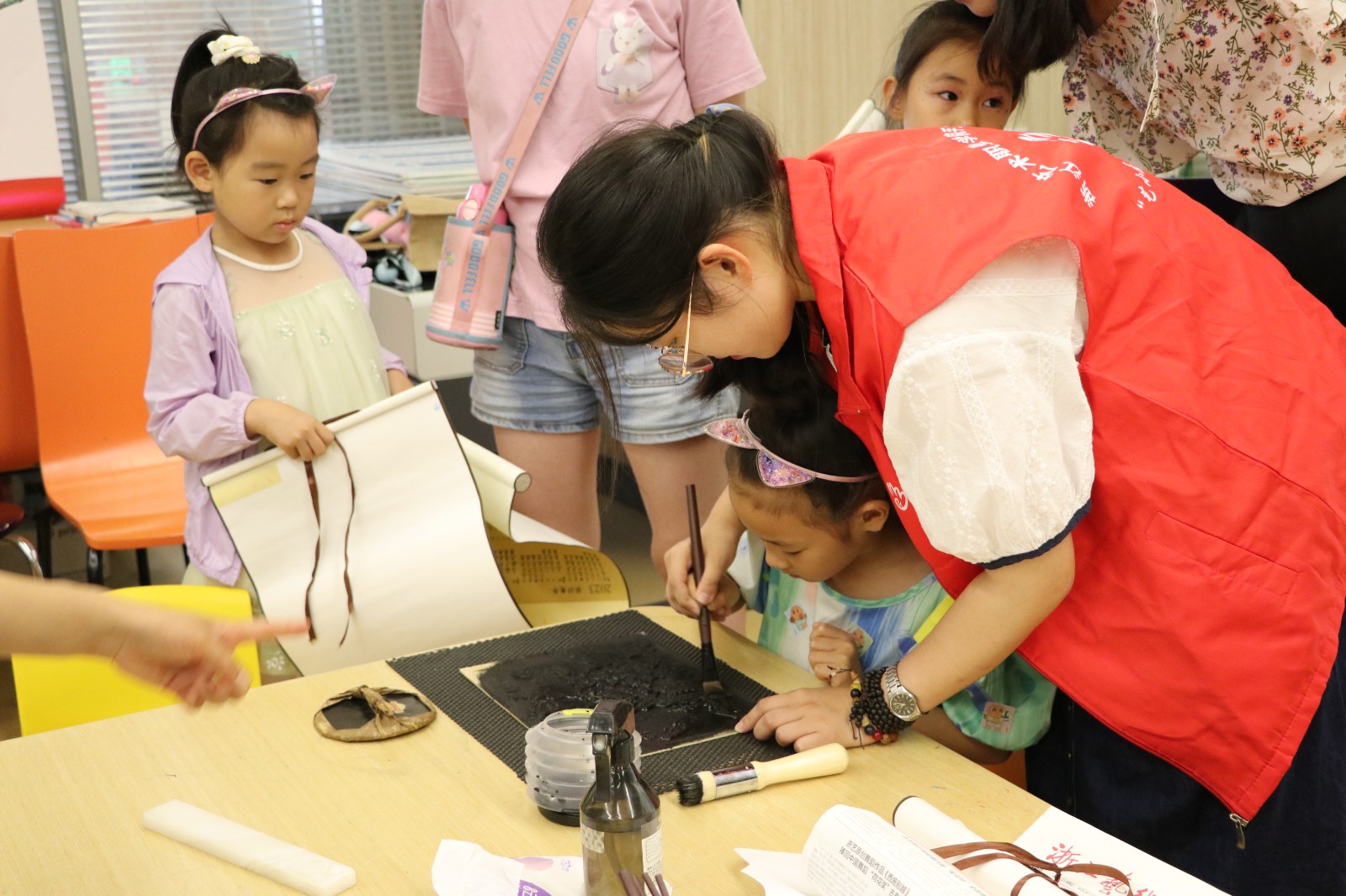 在水印木刻体验中,“艺小匠”详细讲解了水印木刻的印制流程及印制工具。在“艺小匠”的指导下,参与体验的小朋友们将蘸取墨水的刷子在木板上刷色,均匀涂抹版面,观察好版面的位置后把宣纸对准印版平铺,借助马莲来回旋转按压,使纸面和版面上的墨充分接触。